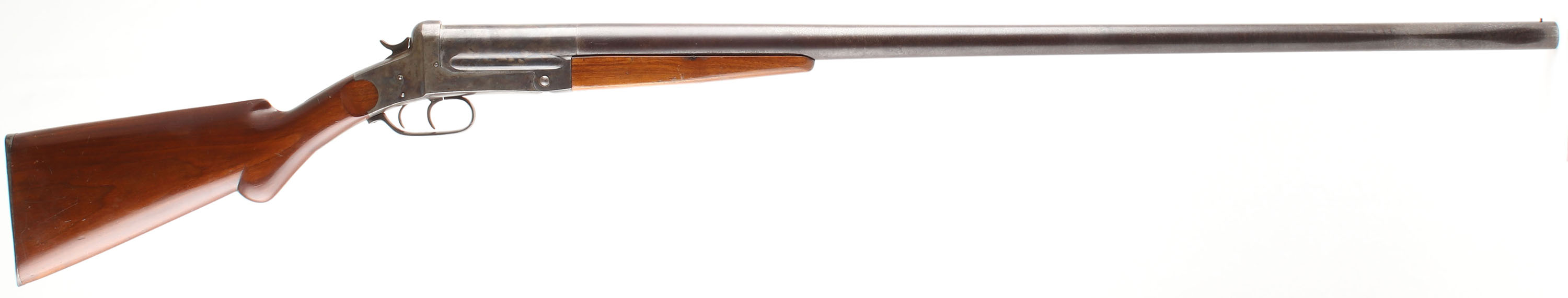 C.S Shattuck, Model ''American'', CAL: 8GA, MFG: 1880-1908, SN: 99, Break Action Single Shot Shotgun, 40'' barrel. The round knob stock & forend appear to be replacements. They are very good, with minor contusions & surface scrapes. The finish on the forend is flaking. The London Twist barrel has fully toned to a brown patina. The frame & barrel end is case-hardened, retaining visible, but faint case-colors, with some intermittent spotting. Bore is excellent. The barrel holds a single front post sight. The front trigger breaks the barrel & the rear trigger fires the gun. Stock carries a smooth metal buttplate. A nice example of a turn-of-the-century large bore shotgun. Notice: London Twist barrels are not safe to shoot smokeless powder or steel shot out of. FFL or C&R Req. - Value: 1000 to 2200