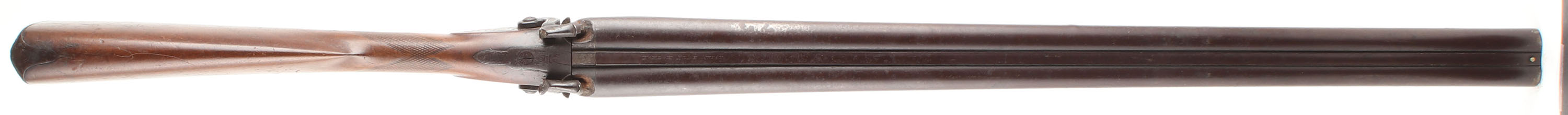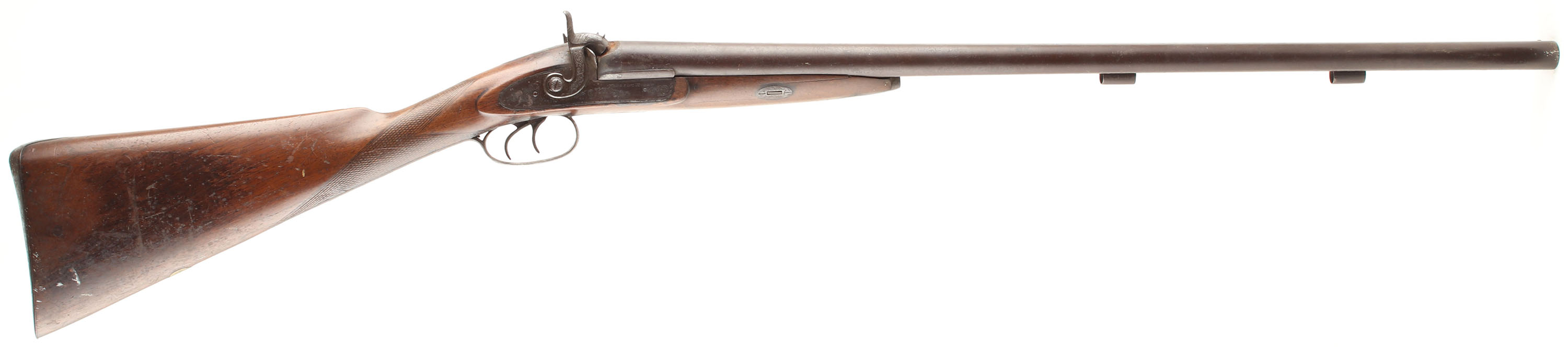 William Moore, Muzzleloader Shotgun, CAL: .78 bore, MFG: N/A, SN: N/A, Percussion Muzzleloader, 28'' barrels. The makers name is marked on both side plates & the rib is marked ''LONDON FINE TWIST''. The original checkered straight grip wood stock is very good & solid. There are a couple hairline cracks coming off the side plates, along with minor contusions, scrapes & dings. There is some darkening to the wood on the right side, cause is unknown. The barrels, receiver, side plates & hammers have all fully toned to a rich brown patina, with consistent rust spotting/speckling throughout. Bores are poor, dark & rough. The solid rib holds a front bead. Stock has a smooth metal buttplate with standing rust. Missing ramrod. The left hammer spur is broken & there is a bulge half way down the left barrel. We recommend this firearm be inspected by a licensed gunsmith before use. SOLD AS IS NO RETURNS. Blackpowder, No FFL Req. - Value: 100 to 300
