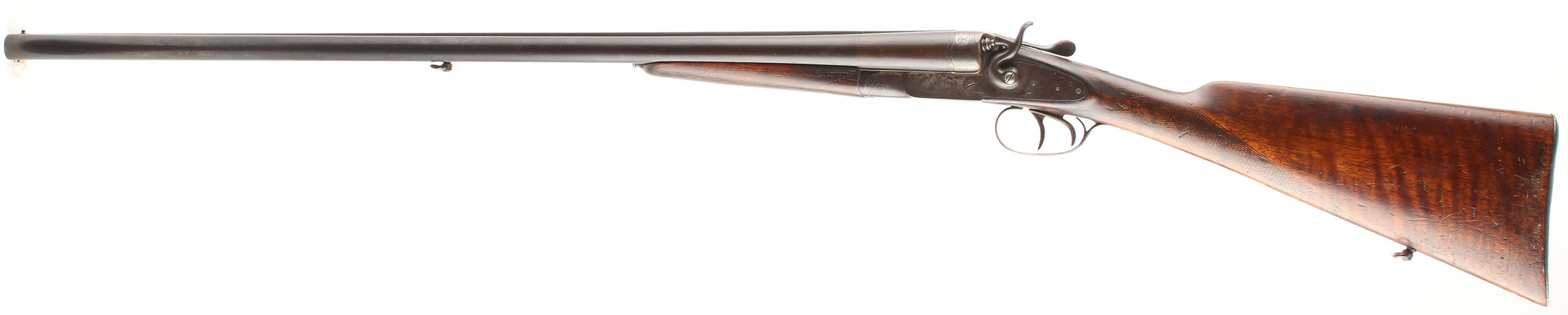 Fuile Rinforzato Hammer Double CAL; 12GA, MFG: N/A, SN: 95679, Break Action SxS, Choke: Full/Full, 27 1/2'' barrel. The side plates are marked with the makers name, the bottom of the receiver is marked ''MONOBLO BERETTA/BRESCIA'' & the barrel is marked ''P.BERETTA GARDONE V.T BRESCIA''. The original checkered straight grip stocks are very good & solid, having been sanded & refinished. There are numerous contusions, dings, scratches & scrapes throughout. The blued finish on the barrels has full toned to smooth brown patina. The nickeled receiver & side plates have remnants of nickel finish in heavily protected areas, but mostly worn to metal gray & toned to a brown patina. Bores are poor, bright, but heavily pitted. The Solid matted rib holds a front bead. Stock has a Beretta grooved metal buttplate. Sling loops. Double triggers. FFL or C&R Req. - Value: 200 to 400