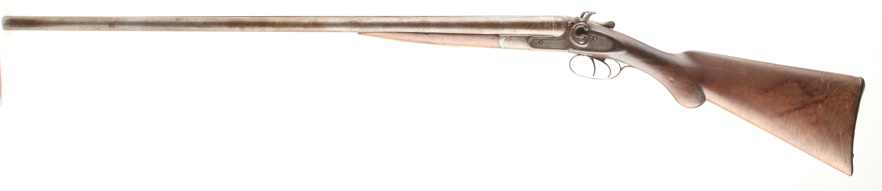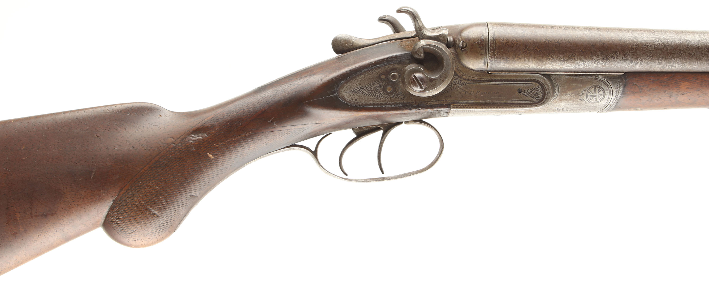 Ed Parker, Hammer Double, CAL: 12GA, MFG: 1880's-1900's, SN: 613, Break Action SxS, Choke: Full/Mod, 30'' Damascus barrels. The side plates are marked ''ED PARKER'' & the barrel rib is marked ''ED PARKER LONDON FINE DAMASCUS''. British proofs on the water table. The original checkered round knob wood stocks are very good & solid, having been sanded & refinished. There are a few small grain cracks coming off the side plates/upper tang, edge chips, smoothed contusions, scrapes & dings throughout. The forend ebony tip is missing. The fingerprint Damascus pattern on the barrels is visible & the browned finish has worn to an uneven mix of remaining finish & metal gray. The receiver has also fully worn to metal gray & toned to a brown patina. The receiver, trigger guard, side plates, break lever & forend release lever all display simple ornamental hand engraving. Bores are poor, dark & pitted. The solid matted rib holds a front bead. Stock has a worn horn buttplate. Double triggers. There is a good amount of play in the break lever. You can easily slide it to the open or closed position without any tension. There is also play between the barrels & receiver, they don't lock up tight. We recommend this shotgun be inspected by a licensed gunsmith before use. SOLD AS IS NO RETURNS. FFL or C&R Req. - Value: 200 to 400