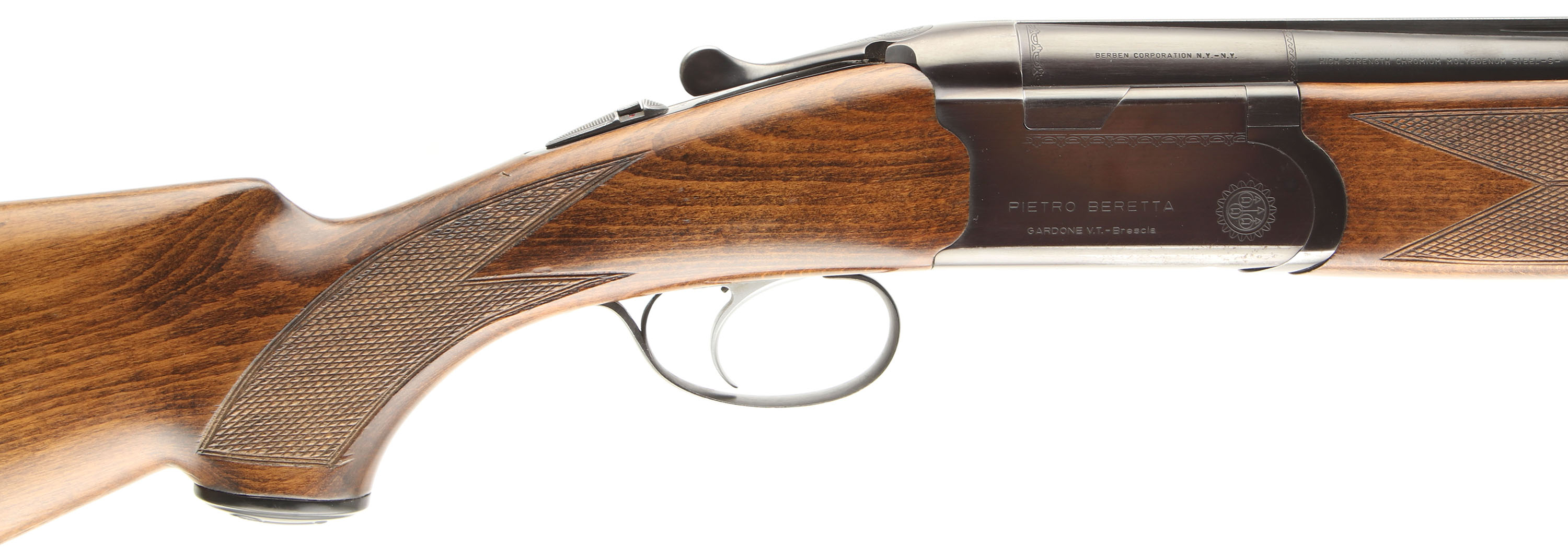 P. Beretta (Imp. by Berben Corp. NY), BL-2/S, CAL: 20GA (marked 12 GA), MFG: 1960's-70's, SN: A77033B, Break Action O/U Shotgun, Choke: IC/CYL (measured), F/M (marked), 30'' barrels. This shotgun has bulges in both barrels & was professionally sleeved to 20GA. The original checkered capped pistol grip stocks are excellent. There are only minor handling marks to the original finish. The original blued finish on the barrel rates 95% with concentrated wear at the muzzle & the receiver rates 85%, with wear around the handling areas. The receiver & chamber end of the barrel has toned plum. Bores are excellent. There are two bulges in the top barrel @ 7'' & 10'' from the chamber & one on the bottom, 11'' from the muzzle. The vent rib holds a front bead. Stock has a Beretta ventilated brown rubber recoil pad. Satin silver single selective trigger. FFL or C&R Req. - Value: 300 to 600