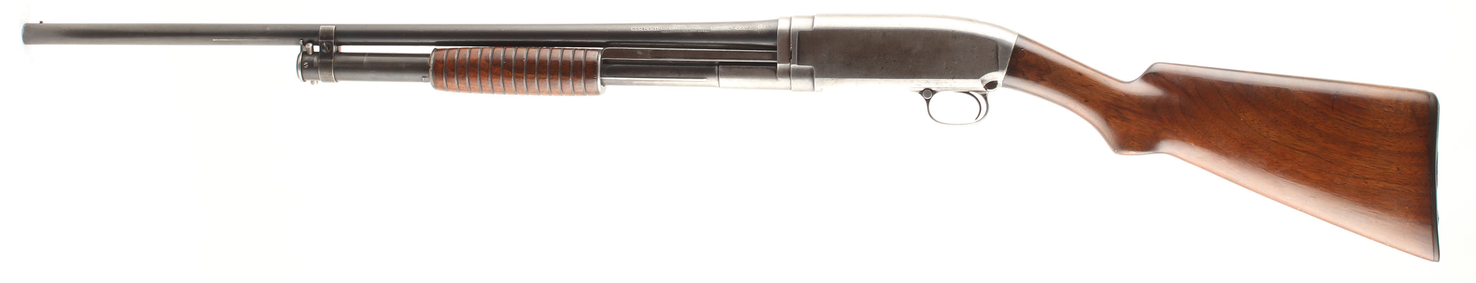 Winchester, Model 1912 Take-Down, CAL: 20 GA., MFG: 1913, SN: 25728, Pump Action, Choke: FULL, 25'' barrel. The original capped pistol grip wood stocks are excellent having been lightly sanded & refinished. There are smoothed contusions, dings & a small spots of flaking on the belly of the stock. The original blued finish rates 40% coverage on barrel. The receiver & mage tube have almost fully worn to a gun metal gray, with remnants of blue & areas toned to a brown patina. Bore is very good, with consistent frost/haze & a couple scars. The barrel holds a front bead. Stock has a Winchester checkered plastic buttplate. FFL or C&R Req. - Value: 400 to 700
