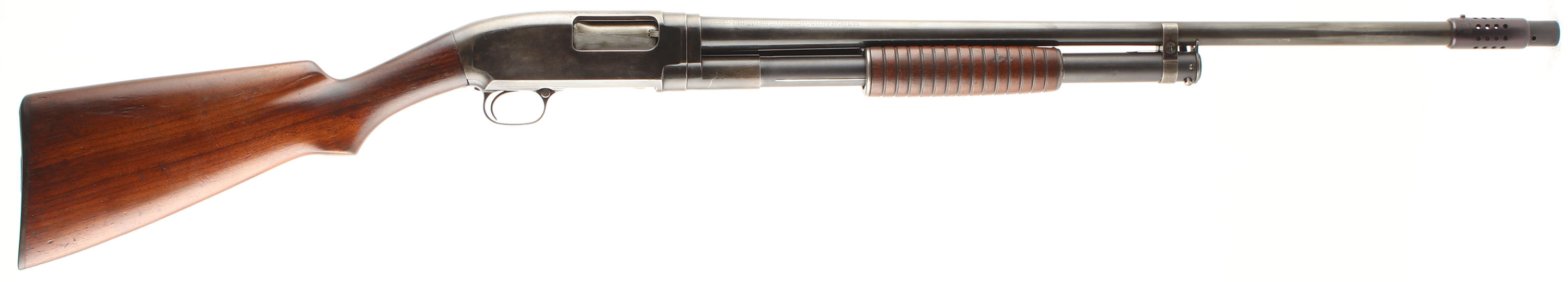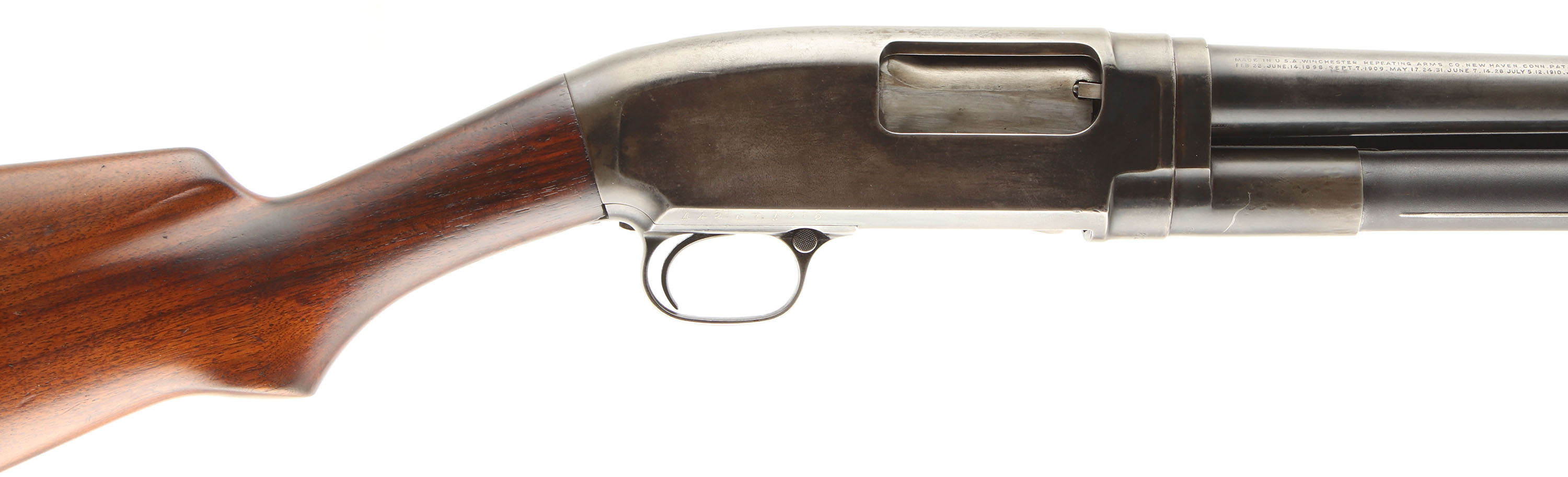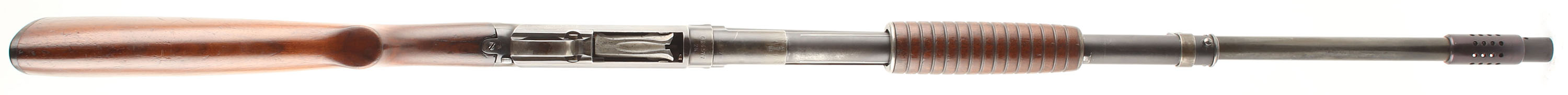 Winchester, Model 12, CAL: 16GA, MFG: 1928, SN: 624577, Pump Action Shotgun, Choke: Full, 2 3/4'' chamber, 24 1/4'' barrel. The original flat pistol grip stocks are very good & solid. There area few small grain cracks around the wrist, coming off the tangs, with surface level scrapes & dings to the finish. Protective oils have been applied over time. The blued finish rates 30% on the barrel, 50% on the receiver & 50% on the mag tube. A SSN is scratched into the right side of the receiver & left slide bar. Bore is excellent. The Weaver Choke system carries a bead sight. Stock has Winchester checkered plastic buttplate. FFL or C&R Req. - Value: 200 to 400