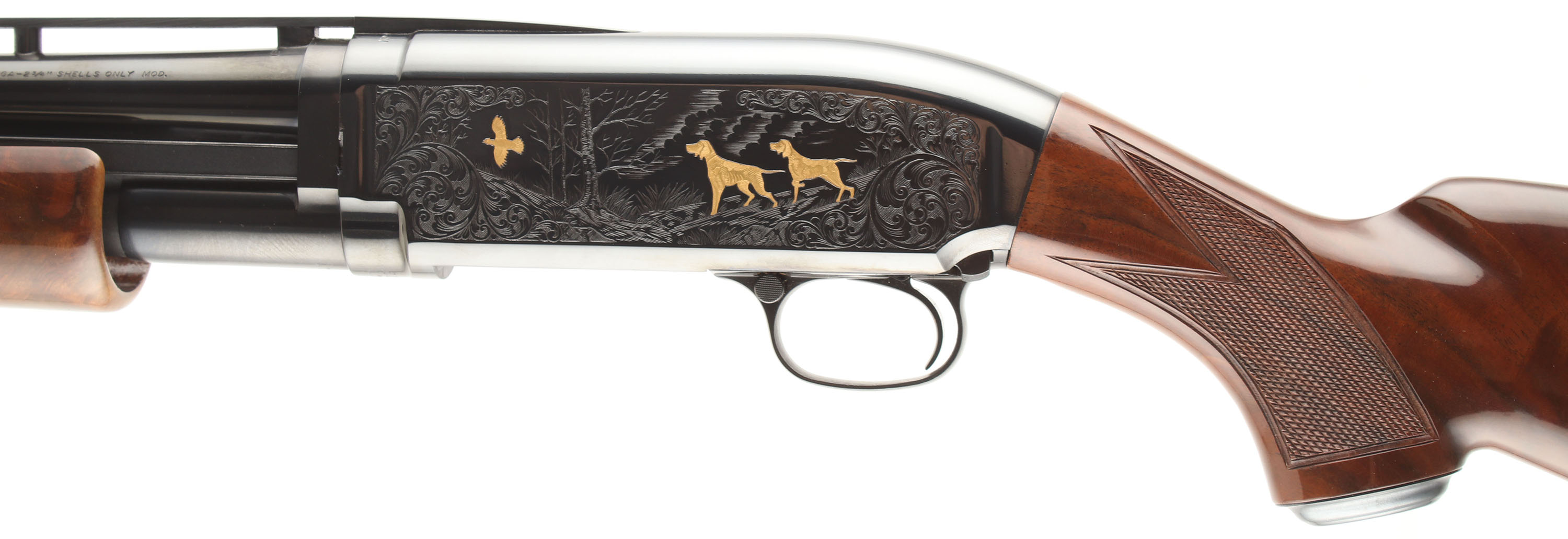 BOXED, Browning, Model 12 Grade 5, CAL; 28GA, MFG: 1991-92, SN: 02641NM972, Pump Action Shotgun, Choke: MOD, 2 3/4'' Chamber, 26'' barrel. The deluxe, checkered & capped pistol grip stock & forend are excellent. The original high gloss finish is excellent, with light storage marks. The original blued finish on the barrel/receiver rates 99%+ & the mag tube rates 97%, with some very minimal wear under the forend. The receiver displays beautiful scroll engravings with gold inlaid bird game scenes on both sides. Bore is mint. The ventilated rib holds a steel front bead. Stock has a factory Browning buttplate. Comes in factory box, with paperwork & original packaging. Consignor states this gun has never been fired outside factory. Only 5000 produced. A high condition, collectors grade shotgun. FFL Req. - Value: 1750 to 2750