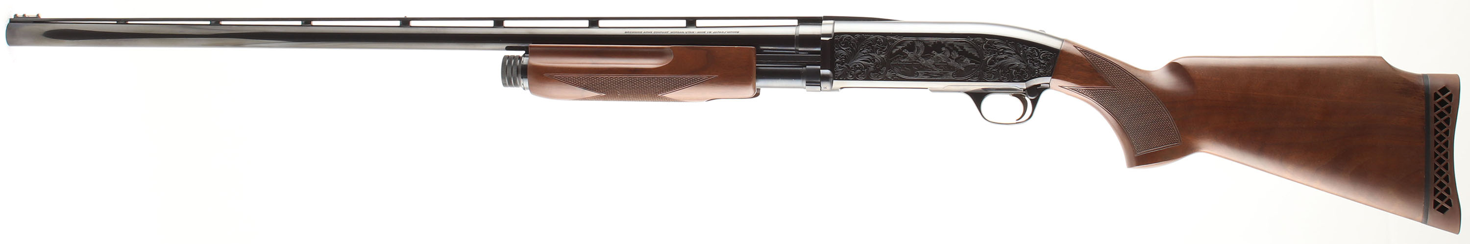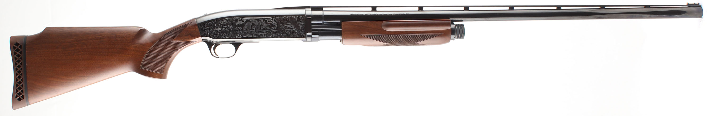 Browning (Japan), BPS Field Model/Hunter, CAL; 12GA, MFG: 1995, SN: 06831MR121, Pump Action Shotgun, 2 3/4'' & 3'' Chamber, 30'' barrel. The original Monte Carlo checkered flat pistol grip stock is excellent. There are only a couple minor handling marks to the finish. The original blued finish rates 99% overall. The receiver displays bird game scenes on both sides, with decorative scroll borders. Receiver engraving became standard in 1991. Bore is excellent. The ventilated, matted rib holds a silver bead front sight. Stock has a Browning factory recoil pad. Gold tone trigger. FFL Req. - Value: 500 to 800