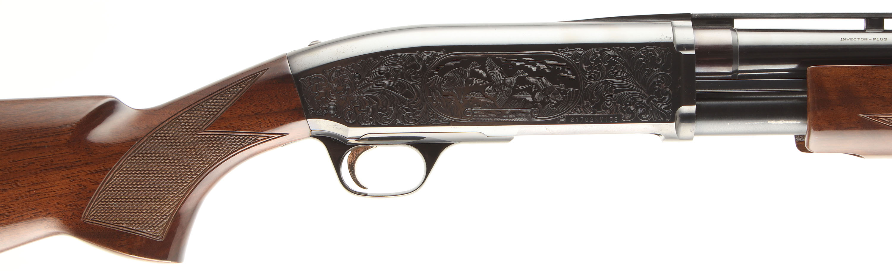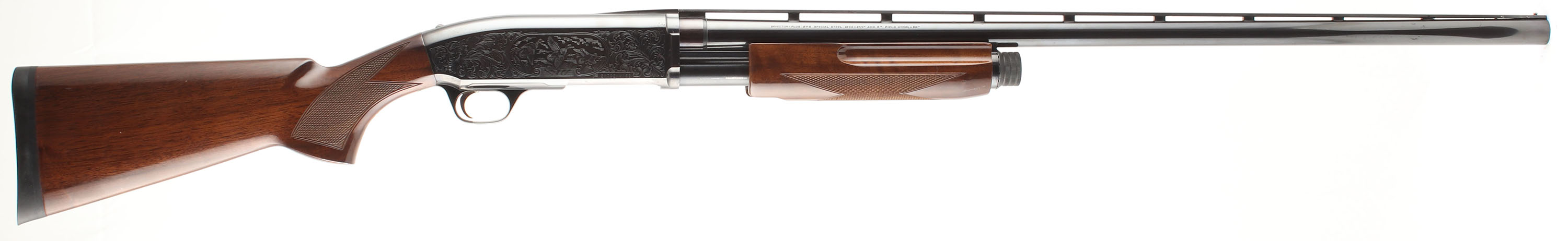 Browning (Japan), BPS Field Model/Hunter, CAL; 12GA, MFG: 1995, SN: 21702NV152, Pump Action Shotgun, 2 3/4'' & 3'' Chamber, 30'' barrel. The original checkered flat pistol grip stock is excellent. There are minor scrapes & one finish level scratch on the left side of the buttstock. The original blued finish on the barrel rates 97%, with the chamber end of the barrel toning plum, & the engraved receiver rates 95%, with minor, intermittent rust speckling. The receiver displays bird game scenes on both sides, with decorative scroll borders. Receiver engraving became standard in 1991. Bore is excellent. The ventilated, matted rib holds a silver bead front sight. Stock has a Browning factory recoil pad. Gold tone trigger. FFL Req. - Value: 500 to 700