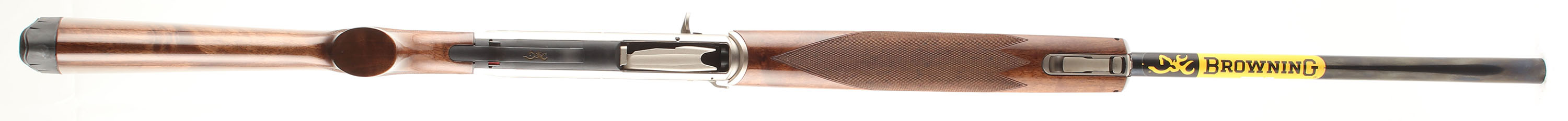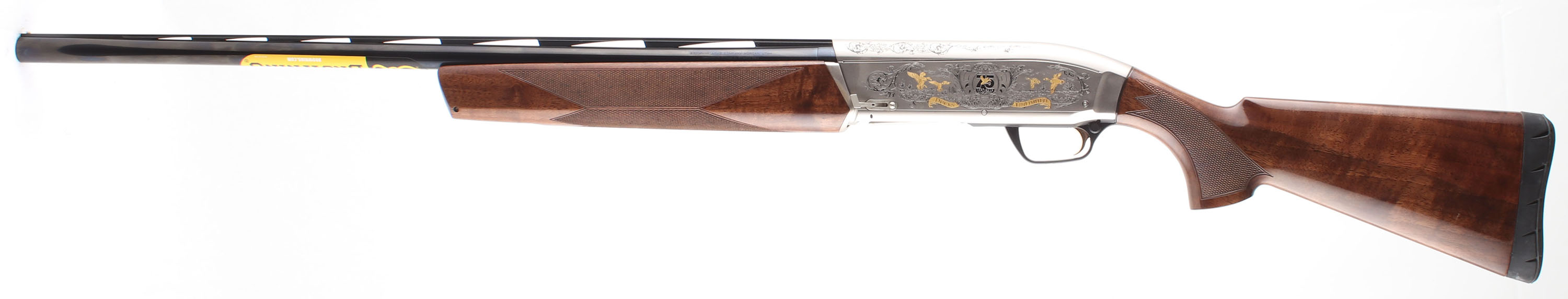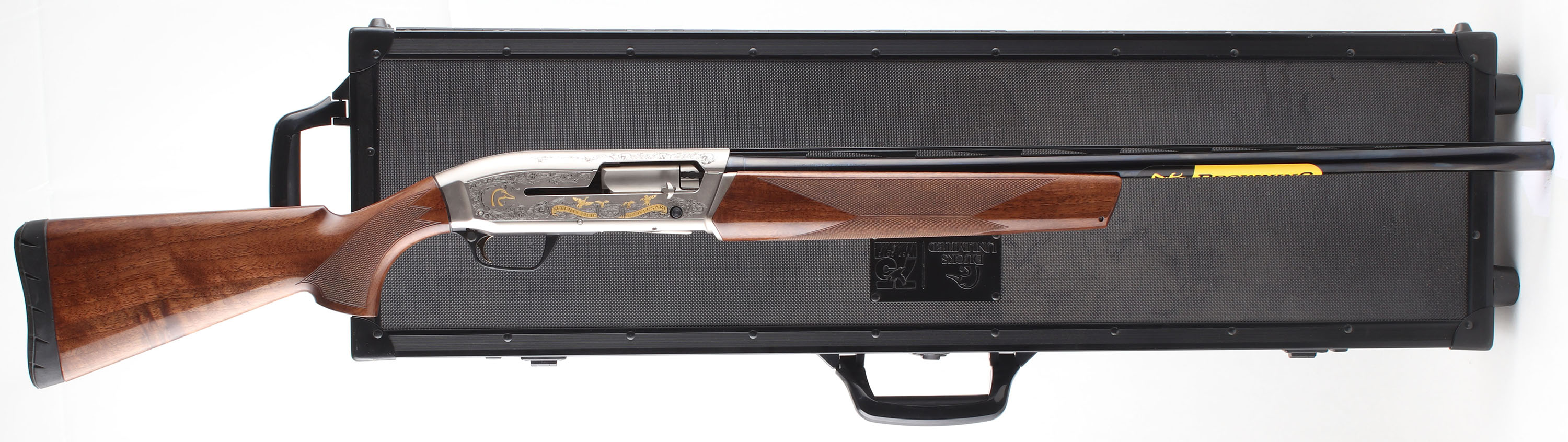 CASED Browning, Maxus Ducks Unlimited 75th Anniversary CAL: 12 GA, MFG: 2012, SN: 2012DU0242, Semi-Auto Shotgun, Choke: screw in Invector (all three), 2 3/4'' & 3'' chamber, 28'' Ventilated matted barrel. Ducks Unlimited 75th Anniversary Special Edition. Featuring elaborately engraved silver coin receiver & fancy checkered walnut stocks. The words ''SEVENTY FIFTH ANNIVERSARY'' & ''DUCKS UNLIMITED'' are engraved in banners across the bolt side of the receiver, along with numerous ducks in hunting scenes. Both wood & metal finishes are as ''NEW''. Bore is mint. Barrel holds a single front bead. Buttstock carries the original Factory recoil pad. Gold trigger. Never shot. Comes in original DU Gun Guard case, with Booklet, lock, paperwork & keys. LOP 14 1/4'' over pad. Excellent DU & Browning collectible. FFL Req. - Value: 1600 to 2200