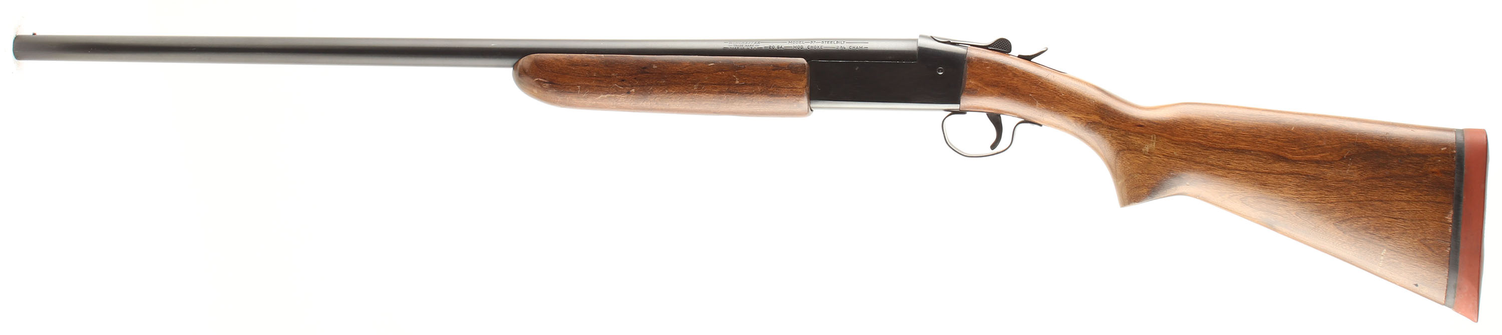 Winchester, Model 37 Steelbilt, CAL: 20GA, MFG: 1936-63, SN: None, Break Action Single Shot Shotgun, Choke: MOD, 2 3/4'' Chamber, 26'' barrel. The original flat pistol grip wood stocks are excellent. There are scratches, scrapes & dings to the original finish. The original blued finish rates 95% overall. Bore is excellent. Barrel carries a single front bead. Stock has a Winchester solid red rubber recoil pad. FFL or C&R Req. - Value: 250 to 450