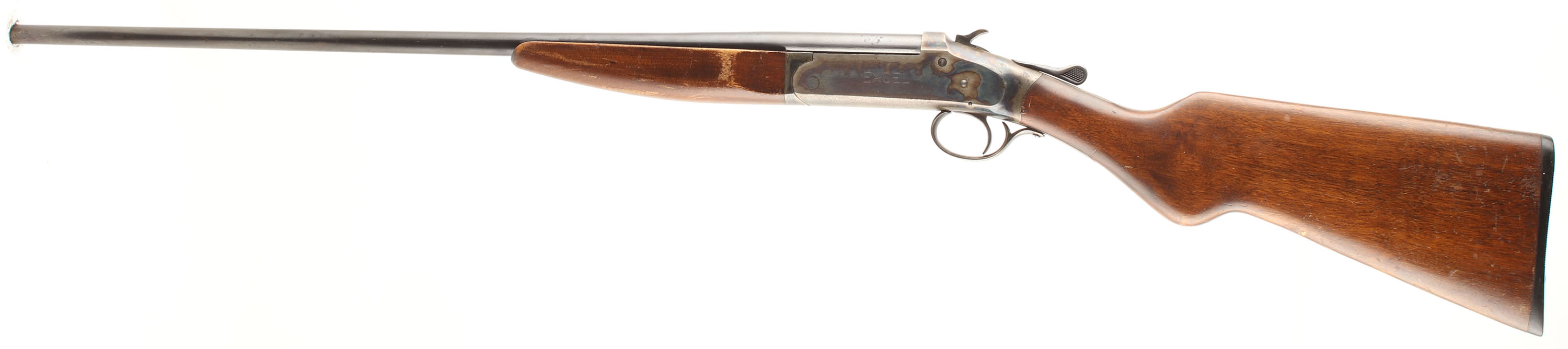 Montgomery Wards, Excel, CAL: 410, MFG: N/A, SN: 97556XF, Break Action Single Shot Shotgun, 26'' barrel. The original round knob stock is very good. There are minor scrapes, dings, nicks & areas of thinning to the original finish. The blued barrel has 40% coverage, with even thinning toned to a brown patina & a small area worn to metal gray at the muzzle. The case-hardened receiver retains visible case-colors, with areas worn to metal gray & toned to a brown patina, with spotting throughout. Bore is excellent. The barrel holds a single front bead. Stock has a grooved plastic buttplate. Mechanical operation appears to function properly. A good shooter .410. FFL or C&R Req. - Value: 150 to 300
