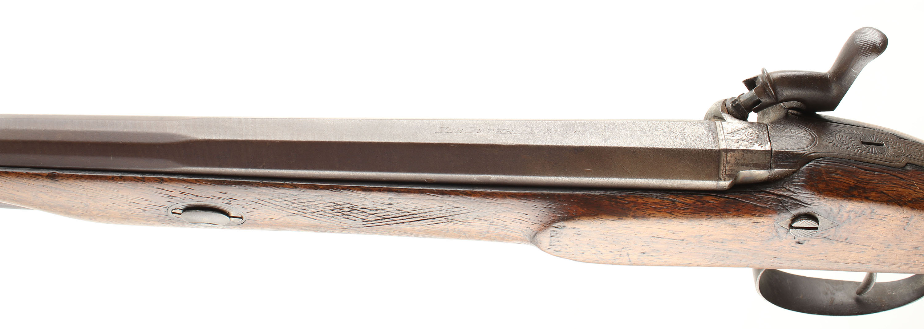 CONDITION: The checkered, straight wrist walnut stock is very good with light nicks, dings, & scratches from use/age. The wood has also slightly shrunk over time leaving the metal proud to the wood around the buttplate & lower tang. Silver medallion embedded into belly of stock. The metal has toned to a chocolate brown patina, with areas of roughness/pitting scars near percussion nipple. The top of the barrel is marked ''THE IMPERIAL SPECIAL''. The marking is faded but still present. The lock plate is marked ''HUDSON BAY Co.'', this marking is worn & the ''BAY Co.'' is heavily faded but still present. The bottom tang is marked with the S/N, again this marking is worn but still present. British BV & BP proofs under barrel. The rear of the barrel, upper tang, trigger guard, lock plate, hammer, buttplate, screws & ram rod escutcheon, all have intricate ornamental engravings. The bore is poor, has rust & pitting. The barrel holds a bead front sight. The stock carries a steel buttplate, toned brown with light roughness. Stock has no sling attachments. Gun has a brass tipped, wooden ramrod. Muzzleloader/ Antique, No FFL Req - Value: 600 to 1200
