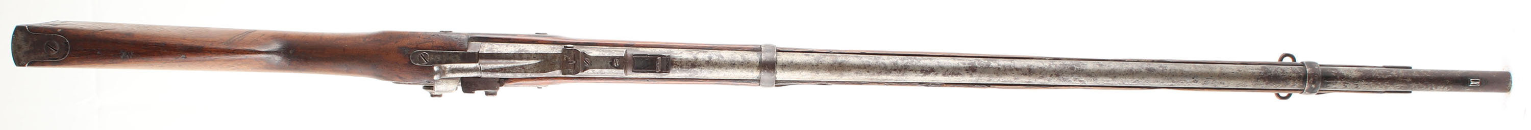 CONDITION: The straight wrist walnut stock is good with various smoothed over nicks, dings, gouges, & scratches from use. There is a hole worn into the bottom of the forend, just in front of the lock plate that is exposing the ramrod channel & ramrod. This was likely caused by saddle wear from carrying across the saddle when riding, common to see on rifles of this era that saw hard use. The right side of the forend has some cracks & wood split repairs. Left flat of the stock has a faded inspector cartouche. The metal has worn gun metal gray with light roughness across the metal & remains of a added black paint in protected areas on all parts of the rifle. The breech block is marked ''1866'', over a eagles head. The lock plate is marked ''1863'', a partial faded American great eagle next to ''US'', over ''BRIDESBURG''. Two-click action. The bore is good to fair. It has thinned rifling with roughness/light pitting. The barrel holds a barleycorn front sight with the original musket L-leaf notch/aperture rear sight. The stock carries a metal buttplate that is a mix of black paint finish, gun metal gray & brown patina. Rifle has the factory front sling loop with the rear loop missing. Rifle has what appears to be a home made ramrod to display with the rifle (end cap threaded). Mechanical function appears solid but with a little ''grittiness'' when the hammer is cycled. Antique, No FFL Req - Value: 600 to 1200