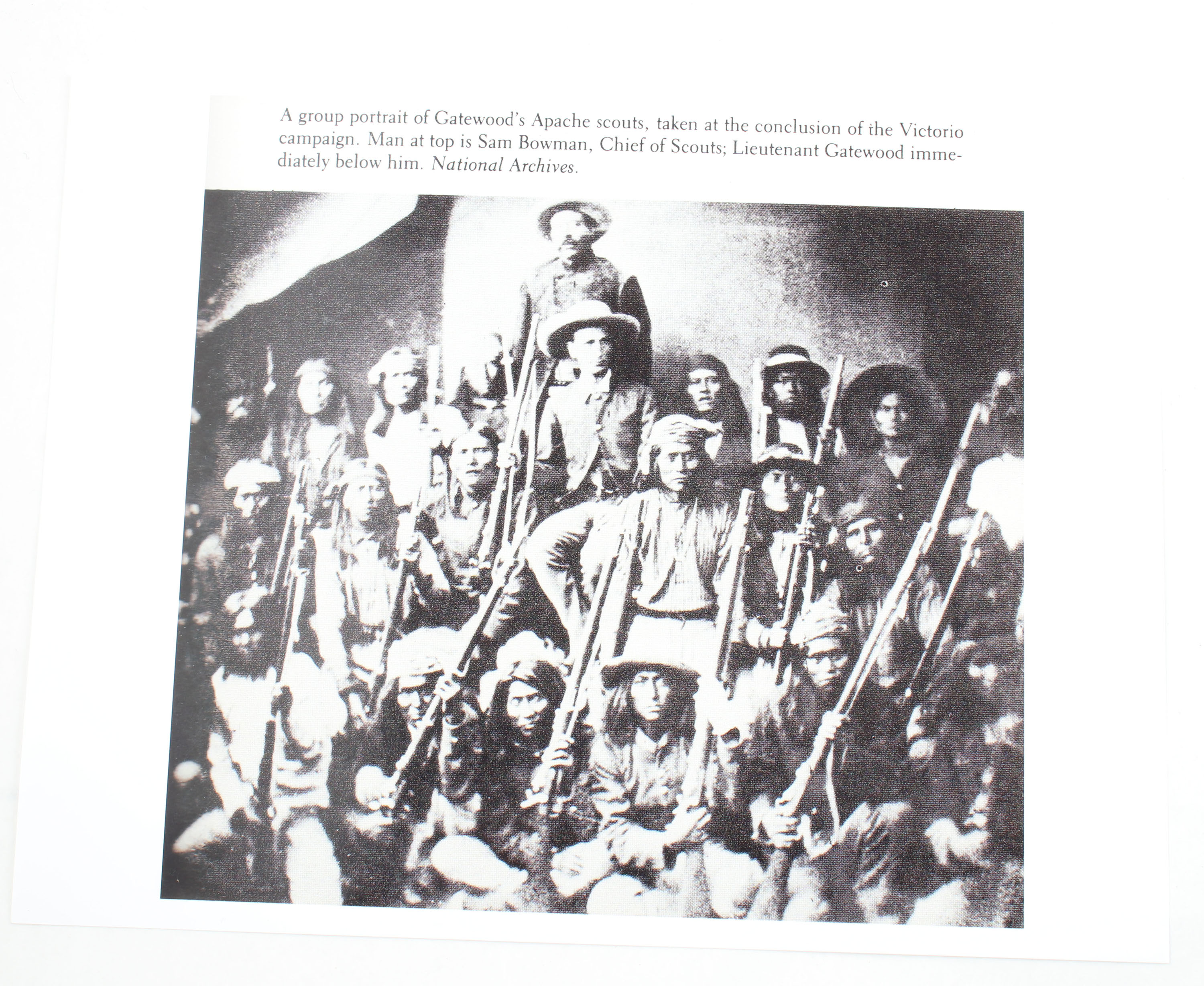 HISTORY: This rifle started as a model 1863 Rifle made by the Bridesburg Machine Works out of Bridesburg, Pennsylvania and owned by Alfred Jenks. They were a private contractor that made Rifles for the US during the Civil war. The Springfield model 1866 is the second Allin-designed trapdoor breech-loading mechanism conversion for Springfield muskets. The Model 1866 fixed many problems with Allin's first model (1865), they added a simplified and improved extractor, relined the .58 Cal barrels to .50 Cal & used the new .50-70 cartridge. The first model used unmodified, old .58 caliber barrels from the muzzleloaders & a .58 RF cartridge. The 1866 model also still used old percussion locks from the 1863 muzzleloader, this would be changed in Allens 3rd model in 1868. Approximately 25,000 .58 caliber Springfield Model 1863 rifled muskets were converted by Springfield Armory into the 1866 model. The Model 1866 was issued to U.S. troops in 1867 and was a major factor in the Wagon Box Fight and the Hayfield Fight, along the Bozeman Trail in 1867. This rifle come from the famous Mike Carrick Collection, he states he bought it from another Famous historian Jeff Hengesbaugh & is one of five rifles Jeff found as a group that were used by Apache Scouts. Included with the rifle is a photo given to Mike from Jeff of a group of Apache Scouts with some M1866 trapdoor rifles.