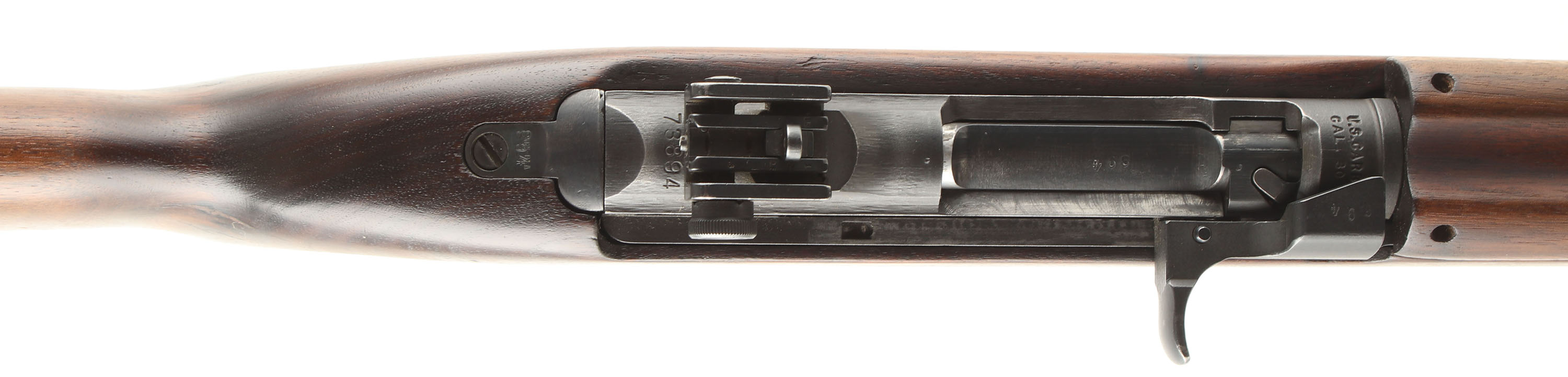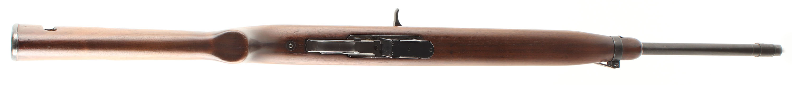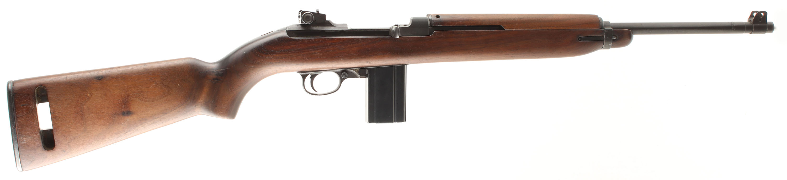 CONDITION: The type 2, semi-pistol grip walnut stock is very good as being lightly sanded & re-finished. The sling well is marked ''JL B'' for manufacture at Jamestown Lounge Co. Jamestown, NY, their prime contractor was IBM, not Inland. No visible cartouches on the stock. The black parkerized finish rates 90% overall with some spots of thinning & wear. The receiver band is marked ''U.S. CARBINE'', ''CAL .30 M1''. The rear of the receiver is marked ''INLAND DIV.'' & the S/N. The end of the barrel is marked ''INLAND MFG. DIV.'', ''GENERAL MOTORS'', ''11-42'', ''P''. The top of the receiver, just ahead of the rear sight has a punch mark. This is a leftover mark from the Rockwell B Hardness test. The bolt, bolt handle, & wrist tang have the last three digits of the S/N stamped into them, this is indication of foreign rebuilt/refurbishment as the US did not officaly mare parts like this. The bore is very good. It's bright & shiny with thinned rifling & light roughness. The barrel holds a blade front sight with protective wings. The rear of the receiver holds the updated fully adjustable aperture rear marked out to 300 yards. The stock carried a checkered parkerized steel buttplate, edges are worn gray. Rifle has the front sling loops with the rear well. Period correct no bayonet lug as they were added near the end of the war, & early push button safety. Rifle comes with one 15 Rd. magazine marked ''MN'' on the back spine. Mechanical function appears solid. FFL or C&R Req - Value: 1000 to 2000