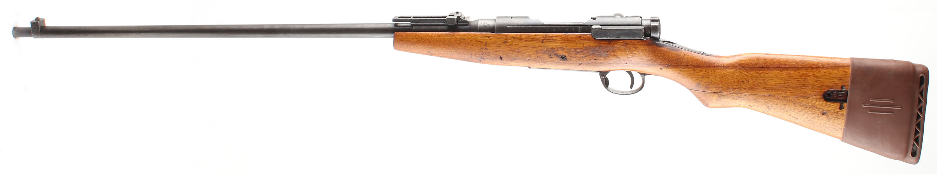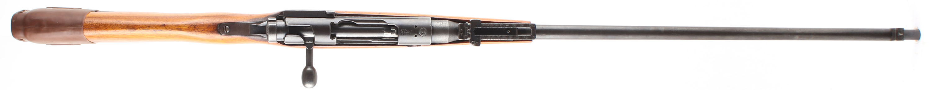 CONDITION: The semi-pistol grip Japanese Walnut (Oni-gurumi or Siebold walnut) stock is very good as being cut down, shaped, lightly sanded & refinished. There are still present deeper dings/gouges from after the refinish, as well as some newer nicks, dings, & scuffs from after. Two-piece Japanese buttstock. Inside of the rear sling cutout is marked ''W''. The metal carries a old thin re-blue that retains almost full coverage but is toning to a mix of gray & brown patina with speckled rust & spots of roughness from cleaned pitting present on the barrel. Some spots of deeper blue are still present at the rear of the receiver. The receiver band is marked with a INTACT chrysanthemum (Most were ground off when surrendered rifles as a face-saving gesture), over ''TYPE 38'' in Japanese. The left side of the receiver is marked with the series mark, the S/N, the Nagoya arsenal logo, & Japanese inspectors marks. The left side of the chamber is stamped ''300'' over ''SAV.'' (the barrel was shortened at the chamber end as part of the re-chamber to 300 Savage). The barrel appears to be a later type 99 barrel that was fitted to a type 38 Rec. with a late production 99 style front sight but with the older type 38 rear sight. The barrel is the same length as a factory type 99 from where the chamber tapers down to the barrel, to the muzzle. S/N matching bolt. The bore is good. It's bright & shiny with thin rifling & a couple spots of roughness. The barrel holds a barleycorn front sight & a flip up ladder, V-notch rear sight marked 4 to 24. The stock carries a blued steel cupped buttplate that's worn gray with speckles of brown patina & over applied stock lacquer on the sides. The rifle has no sling mount or a cleaning rod. Rifle does come with a rubber slip on recoil pad/LOP extender. Mechanical function appears solid. FFL or C&R Req - Value: 150 to 300