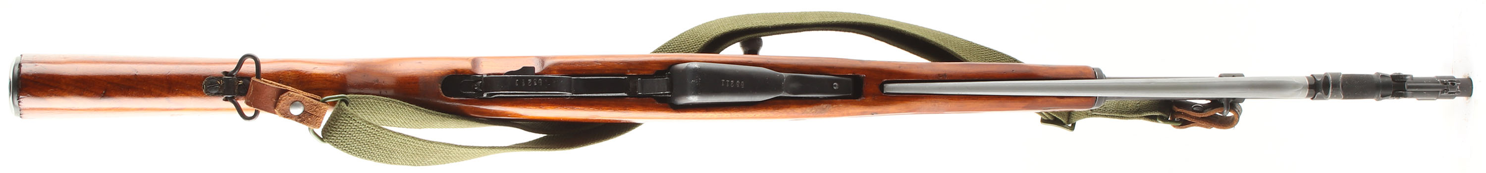 CONDITION: The semi-pistol grip wood stock is excellent with a factory high gloss lacquer but has a couple small scuffs on the edges & some superficial scratches. Left cheek of stock marked with last five digits of the S/N, & The top of the comb is stamped ''82'' in a circle. Left flat of the stock above the mag has a small triangle stamp. The blue metal finish rates 95% overall with small scratches & wear spots on the barrel & the receiver. Left side of the receiver is marked ''636'' in a triangle, ''TYPE 56 CARBINE'' in Chinese, & the S/N. bottom of the barrel, just in front of the forend is marked with import stampings. S/N matching magazine, trigger guard, receiver cover, bolt, bolt carrier, & gas tube (gas tube is electro penciled which is factory). The bore is excellent. It's bright & mirrorlike with little to no visible wear. Chrome lined bore. The barrel holds a post front sight with protective globe, Tangent U-notch rear sight with a ''3'' battle zero mark & 1 to 10 marks. The blue steel trapdoor buttplate has a cleaning kit inside. Rifle has the affixed folding cruciform bayonet & the cleaning rod. Rifle has both factory sling loops & comes with a period correct green canvas sling. Mechanical function appears solid. FFL or C&R Req. - Value: 450 to 850