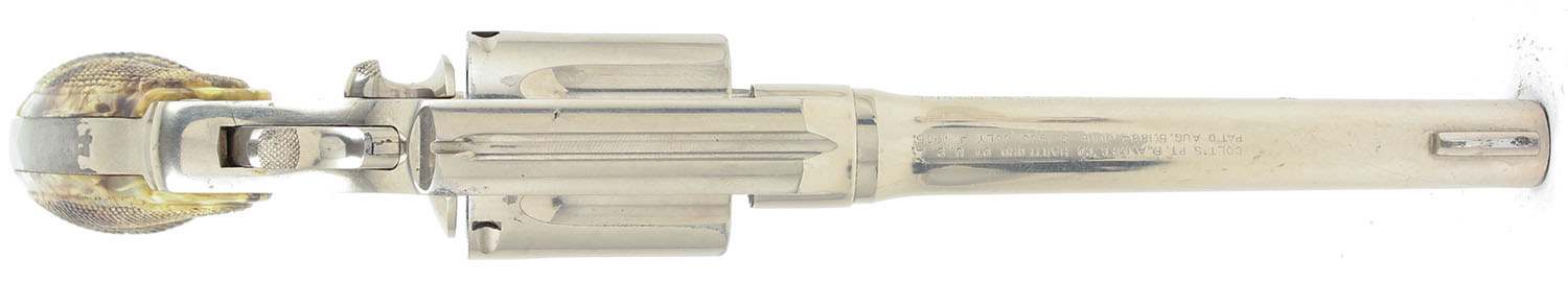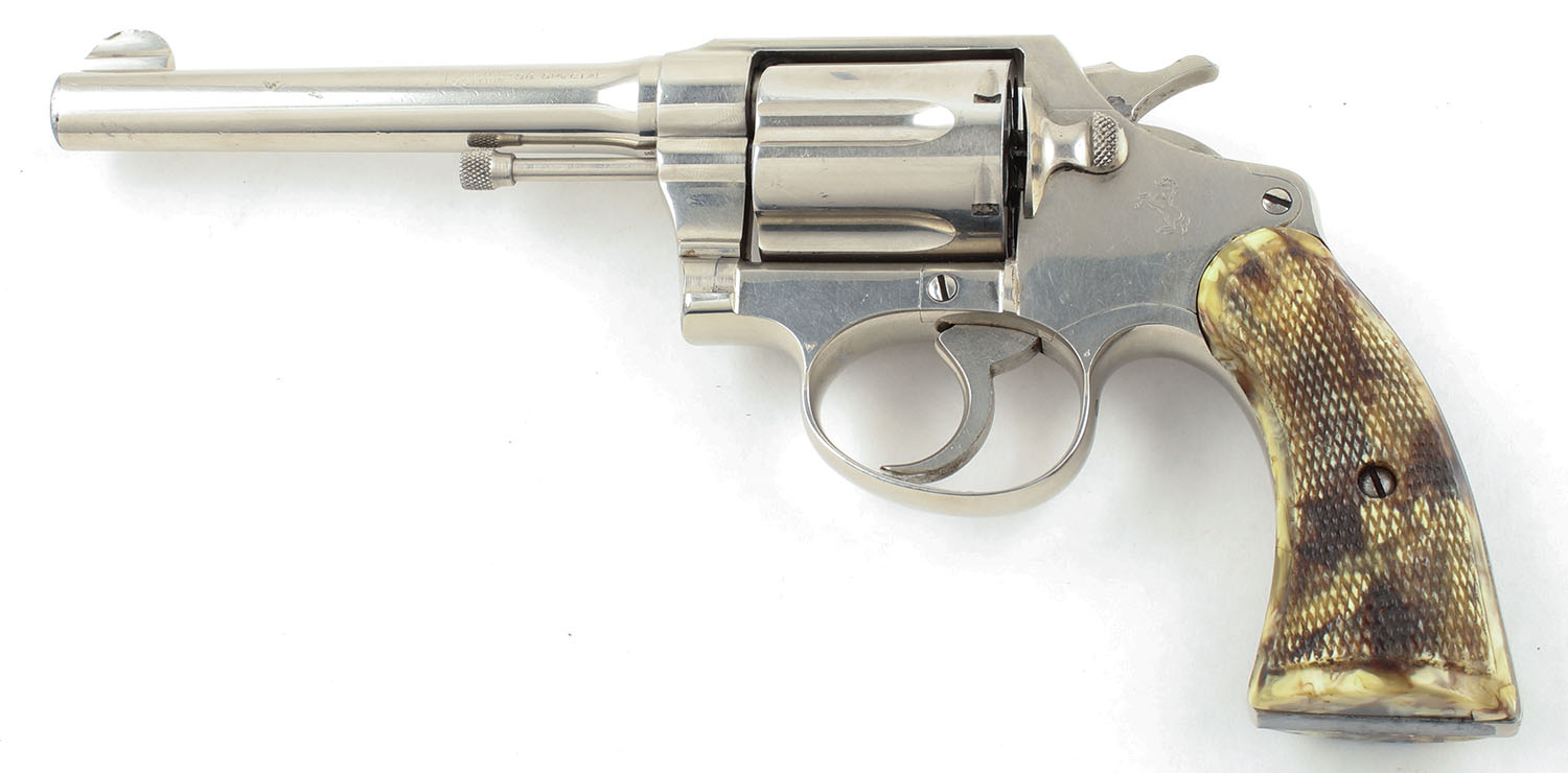 Colt, Police Positive, CAL: 38 SPL, MFG: 1924, SN: 288290, DA/SA Revolver, 5'' Barrel. The checkered plastic multicolor grips are excellent with minimal wear. The metal holds a nickeled finish. The nickeled finish is very good to excellent. The gun has near total coverage with some exposed gun metal grey concentrated near the muzzle & on the backstrap & butt of the grip. The factory markings are slightly thinned but still visible & legible. Bore is very good, near excellent, the rifling is strong & bright with very light roughness throughout. Mechanically solid, seems to function well. A fixed front sight is integral to the barrel, a rear sight notch is cut into the frame. Comes with a ''Eubanks Leather'' brand leather holster with 87PP stamped into it. FFL or C&R Req. - Value: 400 to 800