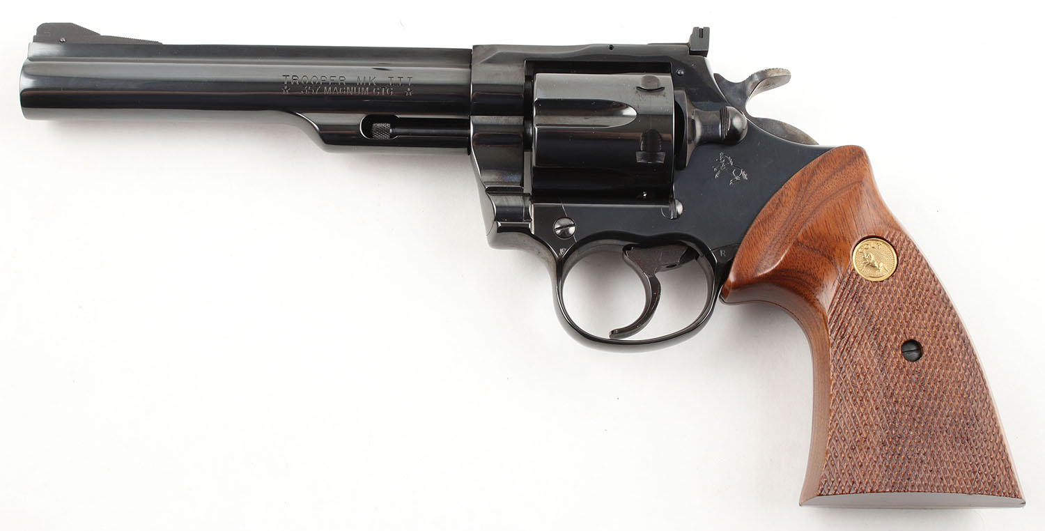 BOXED Colt, Trooper MK III, CAL: 357 MAG, MFG: 1978, SN: L98196, Double Action Revolver, 6'' Barrel. The factory checkered wood grips with Colt medallions are excellent, solid with very light handling wear. The blued finish on the gun is approximately 99% with light wear from use. Bore is excellent, the rifling is bright and strong. Mechanically very solid, seems to function well. There is a serrated front sight pinned to the barrel, a windage and elevation adjustable rear sight is screwed to the top of the frame. The sights have an all black sight picture. The gun comes in the serially matching factory cardboard box with a Colt sight adjustment tool, an owners manual, & other related paperwork. FFL Req. - Value: 800 to 1200