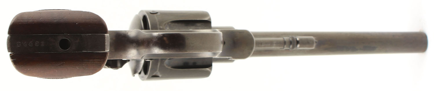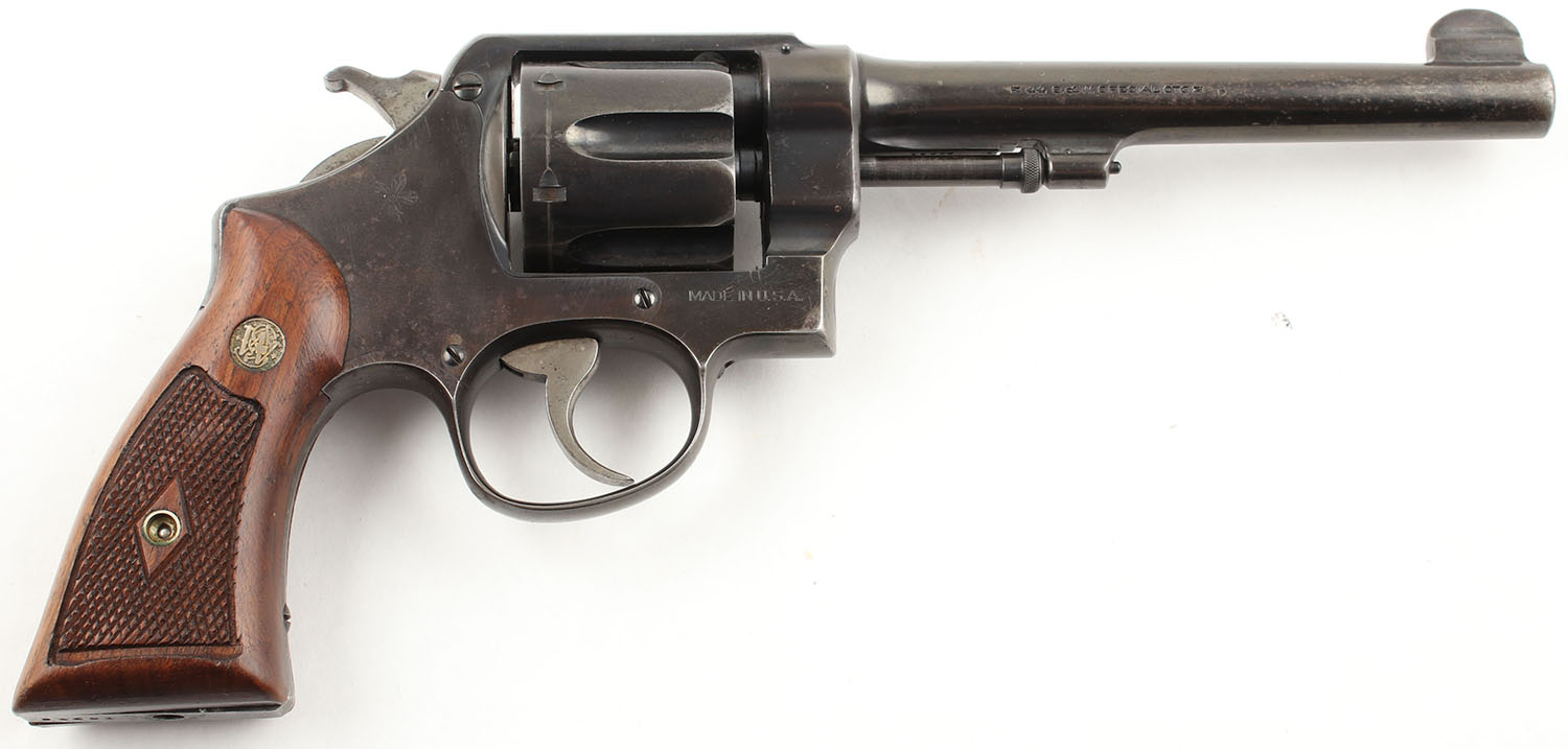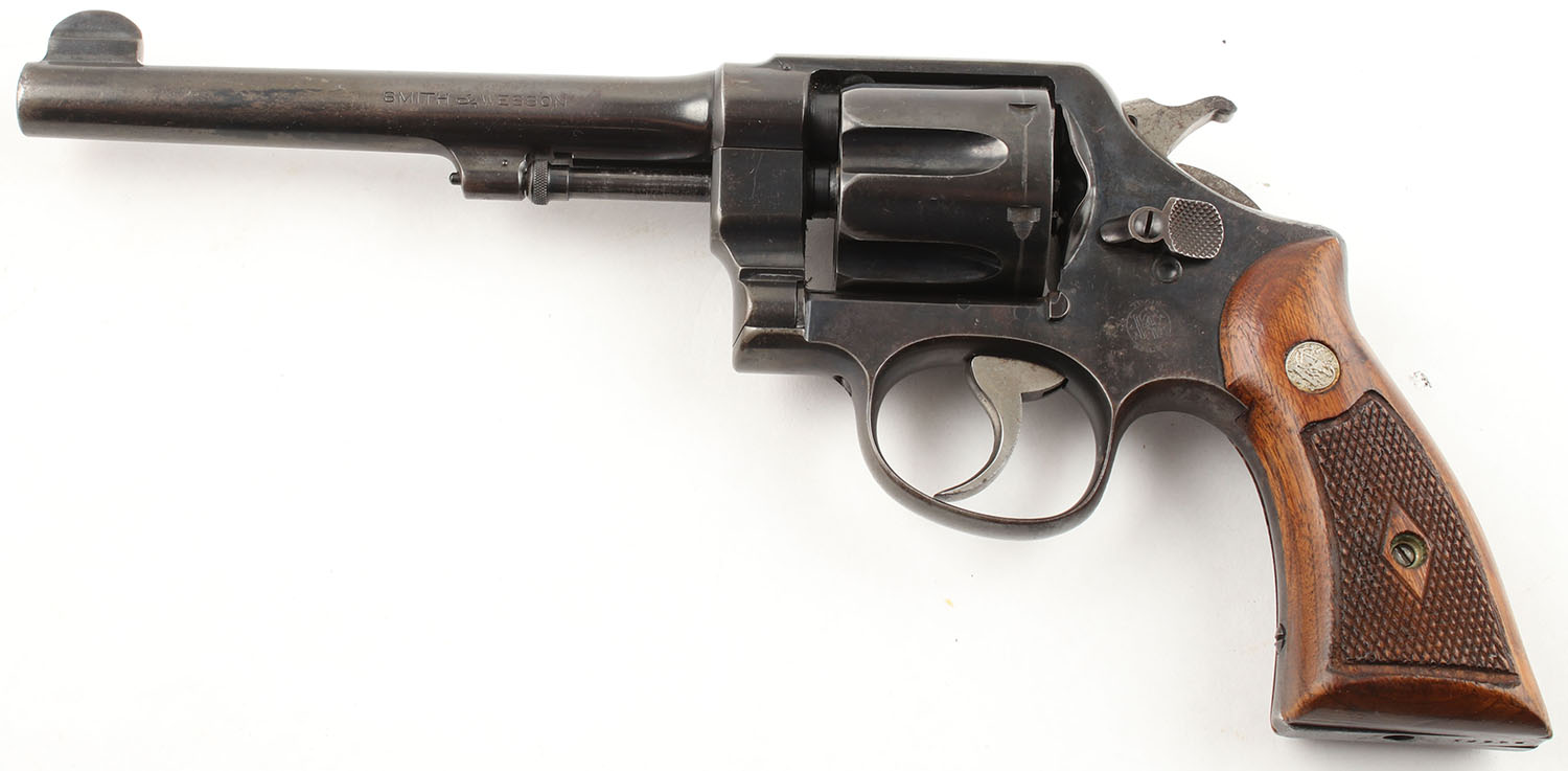 Smith & Wesson, 44 Hand Ejector 2nd Model, CAL: 44 SPL, MFG: 1915-40, SN: 24481, DA/SA Revolver, 6 3/8'' Barrel. The factory checkered wood grips with S&W medallions are very good, near excellent with some handling wear & edge wear on the border surrounding the checkering. The metal holds the factory blued finish which retains approximately 40% originality. The blue has near total coverage. There is exposed gun metal grey is located in common wear areas such as: the barrel near the muzzle, the cylinder (drag line), the grip (front strap/backstrap), & on the edges. Some of the blue has worn thin & begun to tone to a brown patina. The factory markings are slightly thinned but still visible & legible. There is a flower electric penciled into the right side of the frame behind the cylinder. Bore is very good, the rifling is very slightly thinned & relatively bright with a couple of instances of very deep pitting that are spread out. Mechanically solid, seems to function well. The barrel holds a fixed front sight, a rear sight notch is cut into the top of the frame. FFL or C&R Req. - Value: 700 to 1400