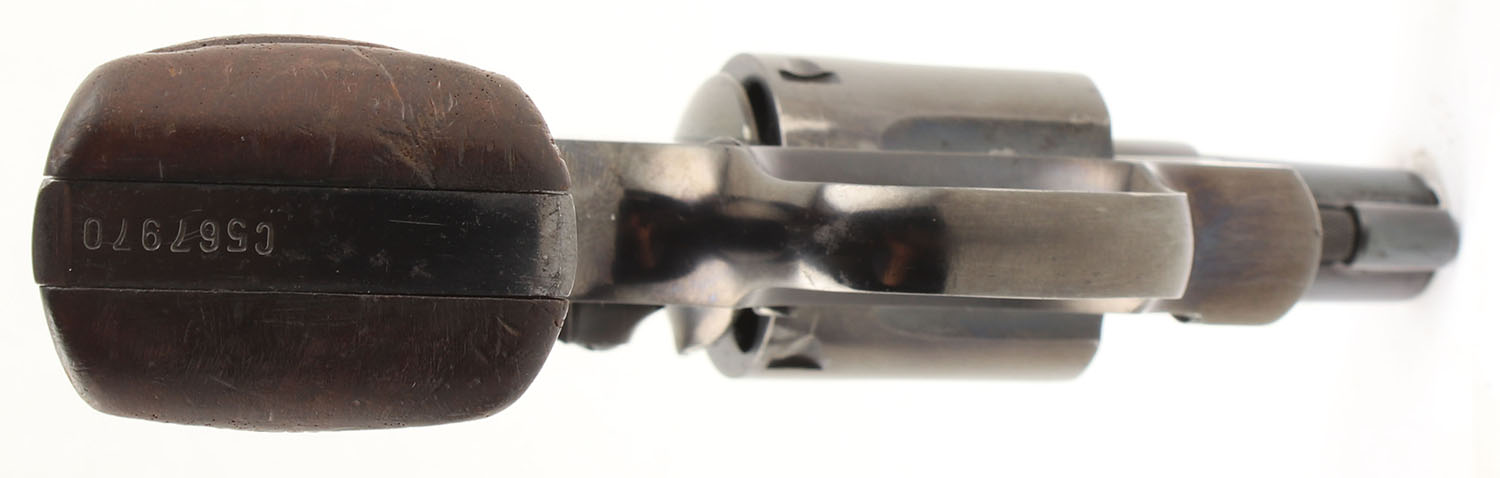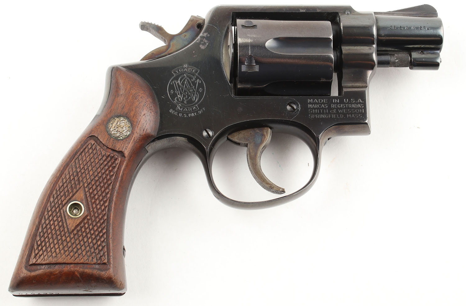 Smith & Wesson, Model 10-2, CAL: 38 SPL, MFG: 1961-62, SN: C567970, DA/SA Revolver, 2'' Barrel. The factory checkered wood grips with ''S&W'' medallions are very good, near excellent, solid with checkering that has worn thin & some small dings & scratches throughout. The metal holds the factory blued finish and rates approximately 95% overall with some use wear, including a drag line. There are a couple of splotches of clean pitting throughout. The case coloring on the hammer & trigger is very good, slightly faded. All of the standard markings around the gun are crisp. Bore is excellent, bright with strong rifling. Mechanically solid, seems to function well. The barrel holds a serrated fixed front ramp sight. A rear sight notch is cut into the top of the frame. The sight picture is all black. Comes in a non-serially matching box that is correct to the make, model, & era with some wax paper. FFL or C&R Req. - Value: 500 to 800