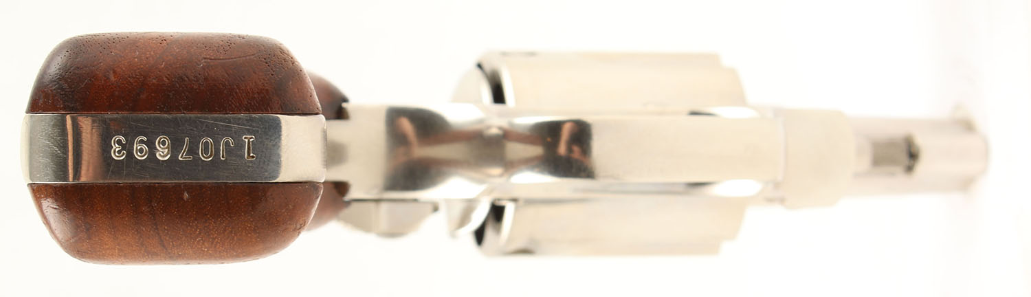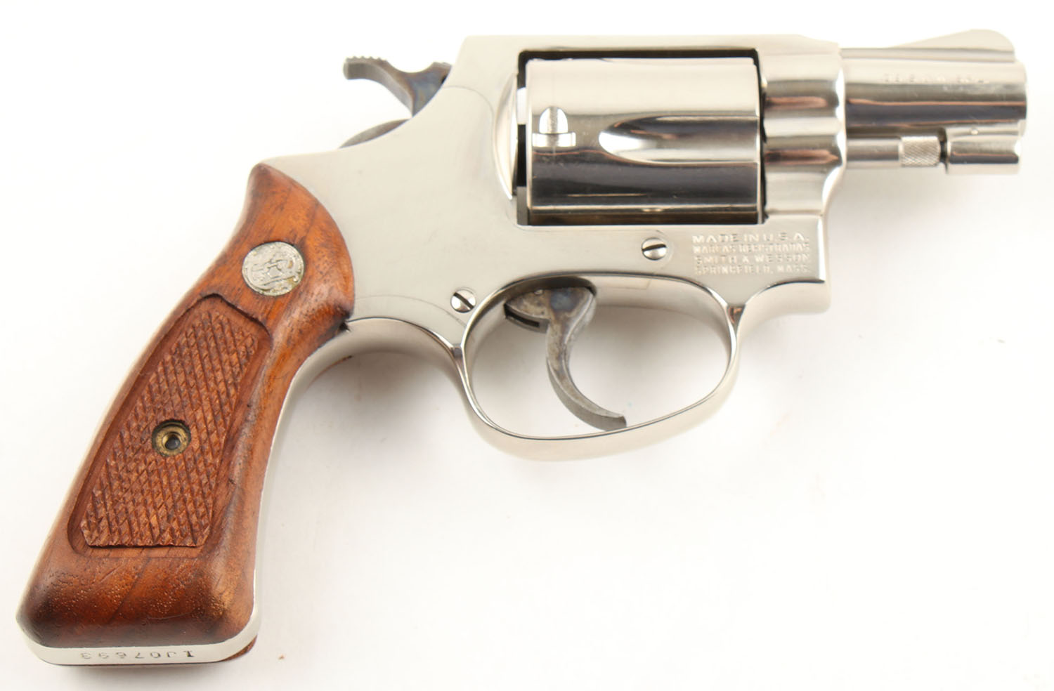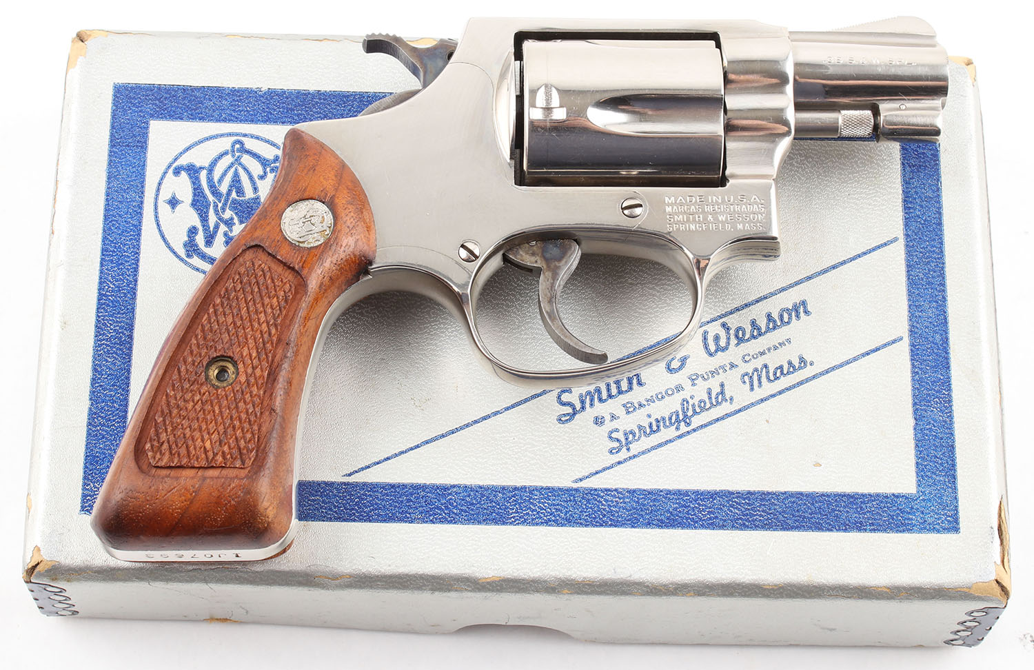 BOXED Smith & Wesson, Model 36, CAL: 38 SPL, MFG: 1982, SN: 1J07693, DA/SA Revolver, 2'' Barrel. The factory checkered wood grips with ''S&W'' medallions are excellent, solid with slightly worn checkering. The metal holds a nickeled finish. The finish is excellent with light use wear including a drag line, some wear near the muzzle & some wear on the front strap & backstrap of the grip. The case coloring on the trigger & hammer is very good, slightly faded. All of the standard markings around the gun are crisp. Bore is excellent, bright with strong rifling. Mechanically solid, seems to function well. The barrel holds a serrated fixed front ramp sight with some red paint or finger nail polish. A rear sight notch is cut into the top of the frame. Comes in a non-serially matching box that is correct to the make, model, & era with some related paperwork & wax paper. FFL Req. - Value: 400 to 600
