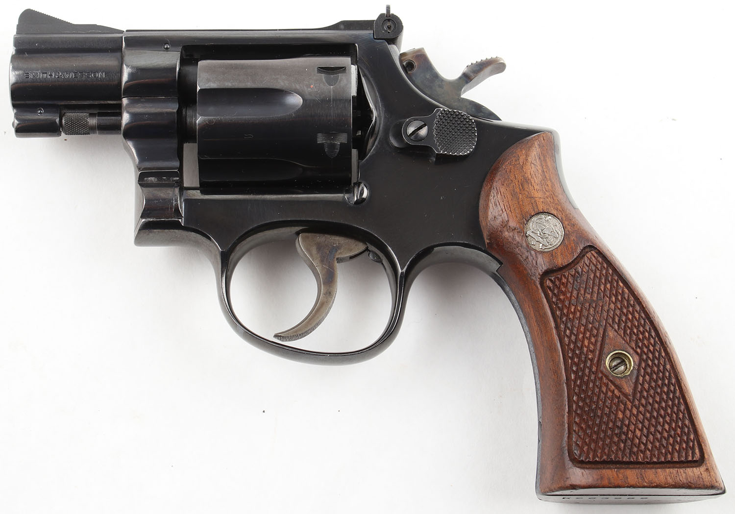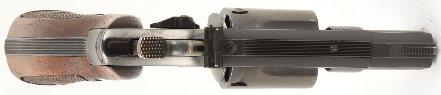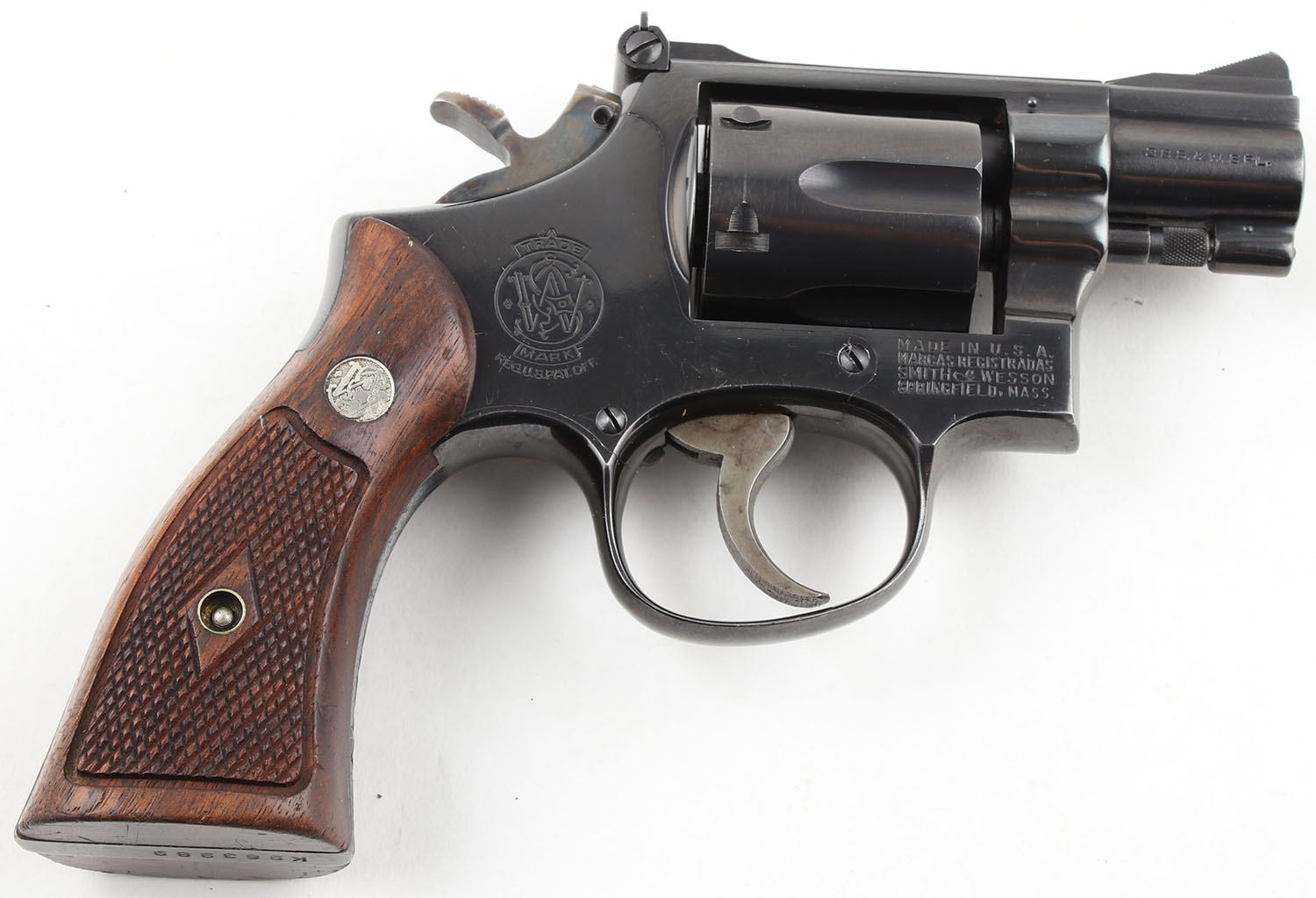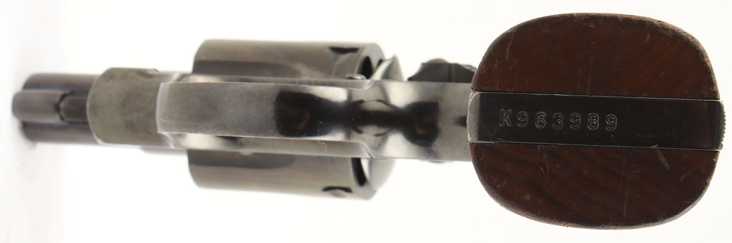 Smith & Wesson, Model 15-3, CAL: 38 SPL, MFG: 1970, SN: K963989, DA/SA Revolver, 2'' Barrel. The factory checkered wood grips with ''S&W'' medallions are excellent, solid with some age soiling & use wear. The factory blued finish on the gun rates approximately 99% with minimal wear including very light holster wear. All of the standard markings around the gun are crisp. Bore is excellent, bright with strong rifling. Mechanically solid, seems to function well. The barrel holds a serrated fixed front ramp sight. A windage & elevation adjustable rear sight is mounted to the top of the frame. FFL Req. - Value: 500 to 800