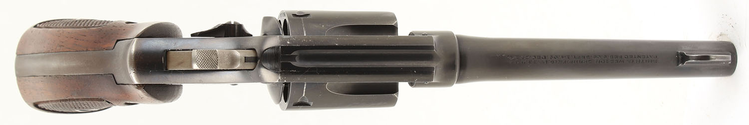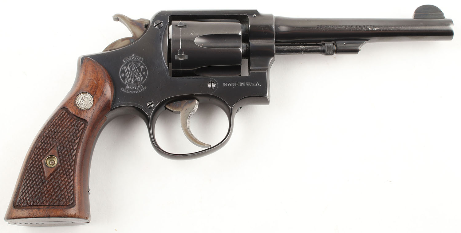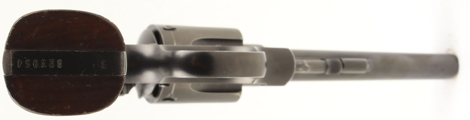 Smith & Wesson, Military & Police ''Pre-Model 10'', CAL: 38 SPL, MFG: 1945-47, SN: S823054, DA/SA Revolver, 5'' Barrel. The factory checkered wood grips with ''S&W'' Medallions are excellent with light edge wear & some small dings & scratches throughout. The factory blued finish on the gun rates approximately 85% with consistent use wear. There is a very defined drag line on the cylinder that has worn to gun metal gray. The blue on the barrel near the muzzle has thinned from holster wear. The front strap has some thinning & scratches from handling & the backstrap has toned almost entirely to a brown patina & thinned substantially. There are some small surface scratches throughout. All of the standard markings around the gun are visible & legible. Bore is excellent, bright with strong rifling. Mechanically solid, seems to function well. The barrel holds a fixed front blade sight. A rear sight notch is cut into the top of the frame. FFL or C&R Req. - Value: 400 to 600