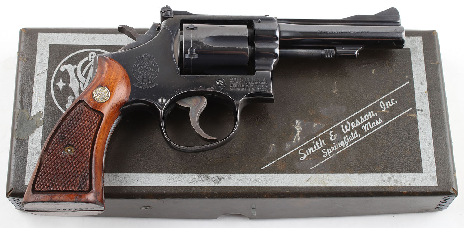 Smith & Wesson, Model 15-3 ''Combat Masterpiece'', CAL: 38 SPL, MFG: 1969, SN: K921732, DA/SA Revolver, 4'' Barrel. The factory checkered wood grips with ''S&W'' Medallions are very good with some edge chipping around the checkering & age soiling. The factory blued finish rates approximately 85% with some surface scratches, edge wear, & wear from use. There is a gun metal gray drag line. The barrel near the muzzle has thinned from holster wear exposing gun metal grey. There is some patina in the serrations of the front strap backstrap. All of the standard markings around the gun are visible & legible. Bore is excellent, bright with strong rifling. Mechanically solid, seems to function well. The barrel holds a serrated fixed front ramp sight. A windage & elevation adjustable rear sight is mounted to the top of the frame. Comes in a Smith & Wesson box with wax paper, a dry fire target, & an owners manual. FFL or C&R Req. - Value: 500 to 800