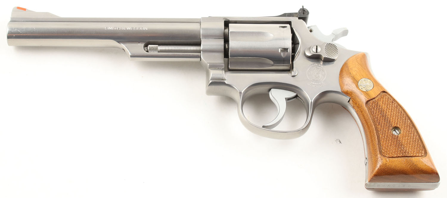 Smith & Wesson, Model 66-2, CAL: 357 MAG, MFG: 1970-2004, SN: BAR0369, DA/SA Revolver, 5 7/8'' Barrel. The factory checkered wood grips with ''S&W'' medallions are excellent with light wear & a couple of small dings. The matte stainless finish on the gun is excellent with some wear from use. All of the standard markings around the gun are crisp. Bore is excellent, bright with strong rifling. Mechanically solid, seems to function well. The barrel holds a fixed front sight with a red plastic insert. A windage & elevation adjustable rear sight is mounted to the top of the frame. FFL Req. - Value: 600 to 900