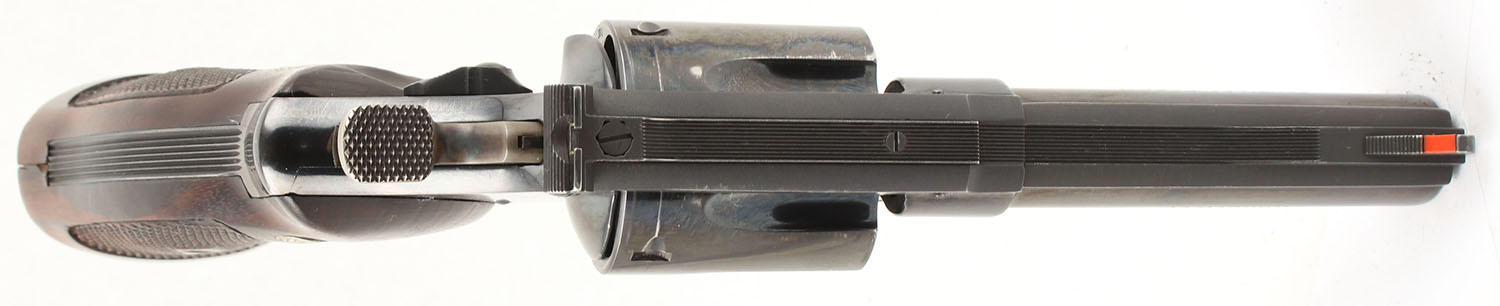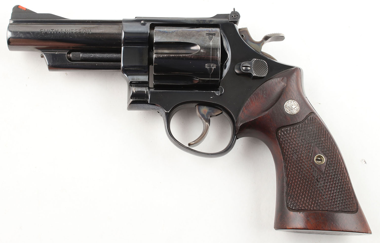 Smith & Wesson, The 44 Magnum ''Pre-Model 29'', CAL: 44 MAG, MFG: 1956-57, SN: S153390, DA/SA Revolver, 4'' Barrel. The factory checkered wood grips with ''S&W'' medallions are excellent with minimal wear & some small dings & scratches throughout. The original blue rates approximately 90% with light wear. The cylinder has a clear drag line & some thinning. There are some small scuffs & dings on the frontmost corners of the frame under the cylinder as well as a clear & consistent scratch pattern throughout the gun. All of the standard markings around the gun are visible & led gable. Bore is excellent, bright with strong rifling. Mechanically solid, seems to function well. The barrel holds a fixed front sight with a red plastic insert. A windage & elevation adjustable rear sight is mounted to the top of the frame. FFL or C&R Req. - Value: 2000 to 3500