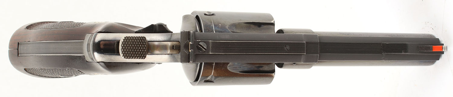 Smith & Wesson, Model 29, CAL: 44 MAG, MFG: 1959-60, SN: S196592, DA/SA Revolver, 4'' Barrel. The factory checkered wood grips with ''S&W'' medallions are very good, near excellent, with some handling wear & small dings & surface scratches throughout. There are also some very small edge chips throughout. The original blue rates approximately 90% with light wear. The cylinder has a clear drag line, the muzzle has some holster wear, & the backstrap has some thinning. There is a clear consistent scratch pattern throughout. All of the standard markings around the gun are crisp. Bore is excellent, bright with strong rifling. Mechanically solid, seems to function well. The barrel holds a fixed front sight with a red plastic insert. A windage & elevation adjustable rear sight is mounted to the top of the frame. Comes with a custom wood display case. The case is lined with blue fabric under which is formed plastic that fits the gun nicely & has a slot for a cleaning rod. A cleaning rod is present with a brush, there is a wood lid for the cleaning rod section which seems to be well made and holds a ''S&W'' medallion. The gun also comes with Smith & Wesson wax paper & a specifications sheet. FFL or C&R Req - Value: 800 to 1600