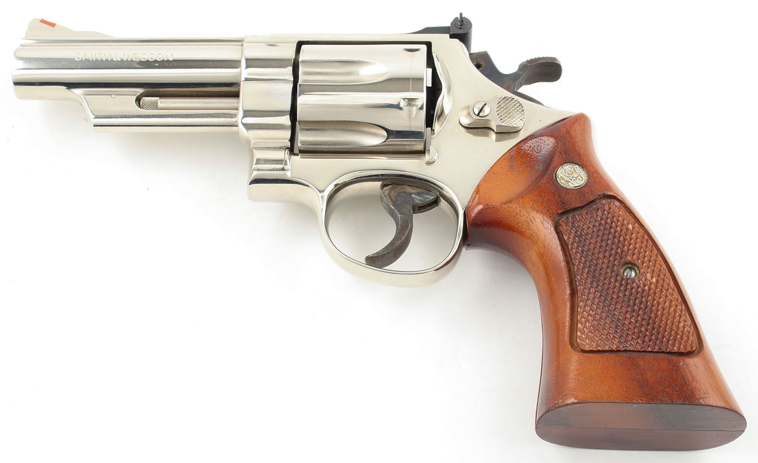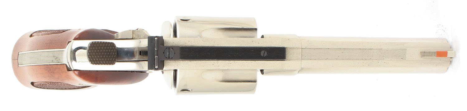 Smith & Wesson, Model 29-2, CAL: 44 MAG, MFG: 1980-83, SN: N889355, DA/SA Revolver, 4 1/8'' Barrel. The factory checkered wood grips with ''S&W'' medallions are very good, near excellent, with light edge chipping near the checkering & some small dings & surface scratches throughout. The original nickeled finish on the gun is good to very good with some use wear & consistent, even speckled erosion showing from under the nickel without erosion poking through. All of the standard markings around the gun are visible & led gable. Bore is excellent, bright with strong rifling. Mechanically solid, seems to function well. The barrel holds a fixed front sight with a red plastic insert. A windage & elevation adjustable rear sight with a white square ''U'' notch is mounted to the top of the frame. FFL or C&R Req. - Value: 600 to 1200