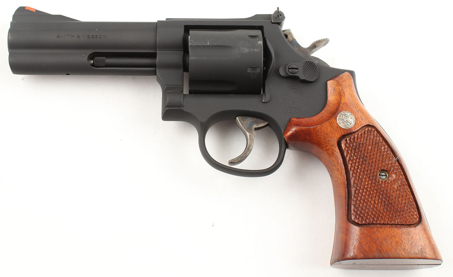 Smith & Wesson, Model 586-1 ''Distinguished Combat Magnum'', CAL: 357 MAG, MFG: 1986-99, SN: AUV6804, DA/SA Revolver, 4'' Barrel. The factory checkered wood grips with ''S&W'' medallions are very good, near excellent, with some handling wear & small dings & surface scratches throughout. There are also a couple of edge chips throughout & a splintered section near the edge of the checkering. The metal carries what appears to be a non-factory professionally applied parkerized finish. The finish is excellent with a drag line & light use wear. All of the standard markings around the gun are slightly faded from the Parkerizing process but still visible & legible. Bore is excellent, bright with strong rifling. Mechanically solid, seems to function well. The barrel holds a fixed front sight with a red plastic insert. A windage & elevation adjustable rear sight with a white square ''U'' notch is mounted to the top of the frame. Comes with a Smith & Wesson factory cardboard box for a 586 with a non matching serial number & other packing material. FFL or C&R Req - Value: 500 to 1000