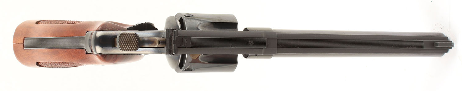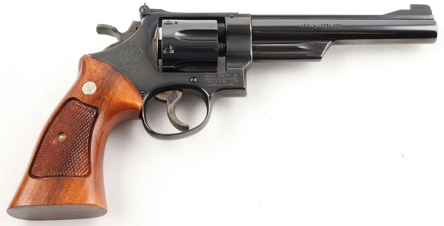 Smith & Wesson, Model 25-2, CAL: 45 ACP, MFG: 1979-80, SN: N672371, DA/SA Revolver, 6 1/2'' Barrel. The factory checkered wood grips with ''S&W'' medallions are excellent, solid with little to no wear & sharp checkering. The factory blued finish rates approximately 99% with minimal wear. All of the standard markings around the gun are crisp. Bore is excellent, bright with strong rifling. Mechanically solid, seems to function well. The barrel holds a fixed front sight. A windage & elevation adjustable rear sight is mounted to the top of the frame. Comes in a very nice custom made wood case with fitted foam that is lined in blue cloth. Inside the case is a screw driver, a bore mop, a cleaning rod, wax paper, an owners manual, & other related paperwork. FFL or C&R Req. - Value: 900 to 1400