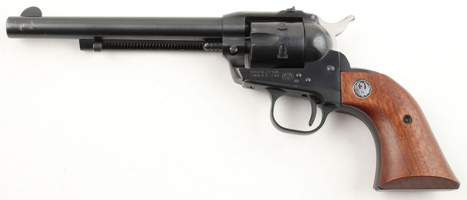 Ruger, Single Six, CAL: 22 LR, MFG: 1971, SN: 21-13737, SAO Revolver, 6 1/2'' Barrel. The factory wood grips with Ruger medallions are excellent with minimal wear. The factory blued finish on the gun rates approximately 95% with light use wear & a couple of exposed gun metal gray on the barrel near the muzzle. All of the standard markings around the gun are crisp. Bore is excellent, bright with strong rifling. Mechanically solid, seems to function well. The barrel holds a fixed front sight. A fixed rear sight is set in a dovetail cut on the top of the frame. Comes with a 22 WMR conversion cylinder, a generic fabric pouch for the cylinder, & a generic soft pistol case. FFL or C&R Req. - Value: 250 to 500