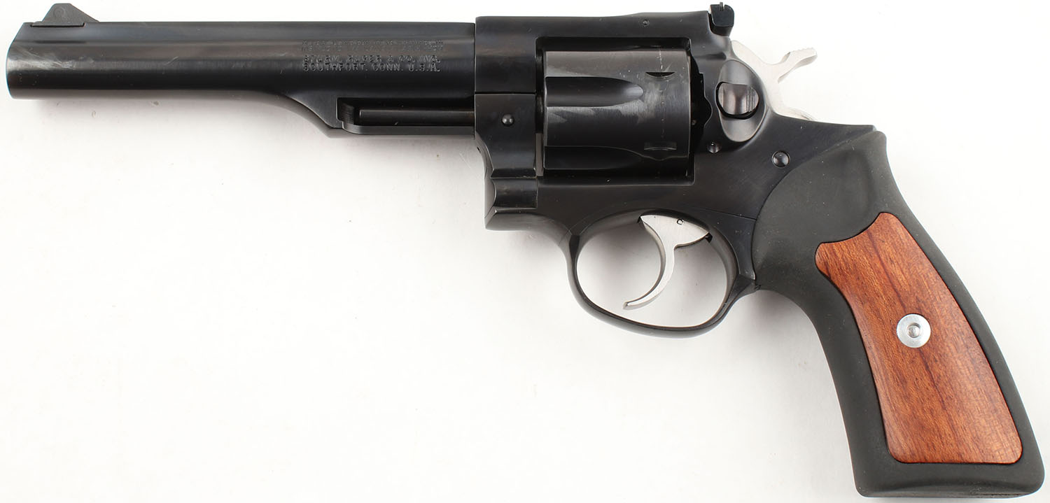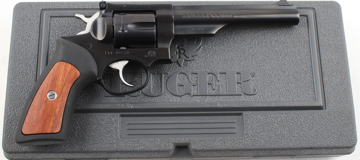 CASED Ruger, GP100, CAL: 357 MAG, MFG: 2003, SN: 174-78130, DA/SA Revolver, 6'' Barrel. The factory rubber grips with wood inserts are excellent with minimal wear. The factory blued finish on the gun rates approximately 99% with light use wear. All of the standard markings around the gun are crisp. Bore is excellent, bright with strong rifling. Mechanically solid, seems to function well. The barrel holds a fixed front sight. A windage & elevation adjustable rear sight is mounted to the top of the frame. Comes in the serially matched factory hard plastic case with a lock, cartridge casings from factory test firing, & an owners manual. FFL Req. - Value: 400 to 600
