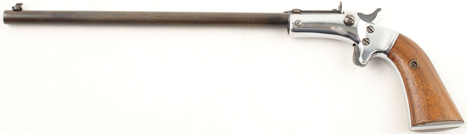 J. Stevens A&T Co., No. 43 ''Diamond'', CAL: 22 LR, MFG: 1896-1916, SN: 61678, Single Shot Tip Up Pistol, 9 3/4'' Barrel. The wood grips are very good, near excellent, solid with light wear. The nickeled finish on the frame is very good, near excellent, with light wear. The blue on the barrel has thinned slightly & toned to a brown patina with some exposed gun metal grey near the muzzle & small remainders of original blue in protected areas. Bore is poor, dark with thin rifling & deep pitting throughout. Mechanically solid, seems to function well. The barrel holds a fixed front sight. A rear sight is set on the top of the frame. FFL or C&R Req. - Value: 100 to 300
