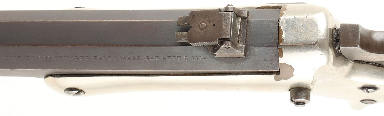 J. Stevens & Co., Model 34 Hunters Pet, CAL: 38 RF, MFG: 1872-87, SN: 76, Single Shot Tip Up Rifle, 18 1/8'' Barrel. The wood grips are excellent, solid with light wear. The nickeled finish on the frame is very good with light wear & some flaking. The blue on the octagonal barrel has thinned on the edges exposing gun metal gray. The blue has toned to a mix of brown patina & original blue with some thinning. Bore is fair to good, slightly thinned & darkened with light even roughness throughout & some splotches of shallow pitting. Mechanically solid, seems to function well. The barrel holds a hooded fixed front sight & a flip up rear sight. FFL or C&R Req. - Value: 600 to 1200