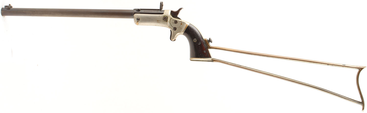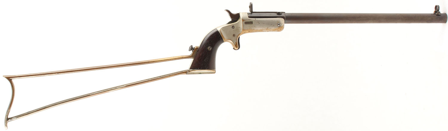 HISTORY: These mid to late 1800's target rifles were meant to be portable, light weight, and accurate. They have stocks that slide into a dovetail cut on the bottom of the grip and are secured by a screw in the back of the grip. These antique ''Pocket Rifles'' are specifically exempt from the NFA and do not require an SBR tax stamp even though they have a short barrel and a stock.