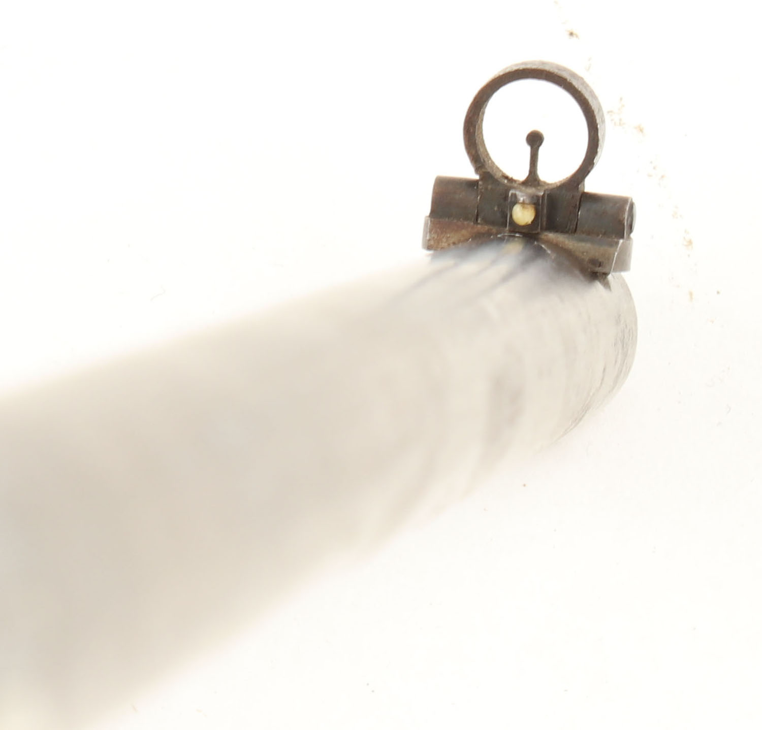 CONDITION: The wood grips are very good, solid with light wear & several gouges on the side of the left grip panel. The nickeled finish on the brass frame retains approximately 60% coverage & has a thick layer of haze. The stock has some small remainders of nickel in protected areas. The blue on the barrel has toned to a thick chocolate patina with some original blue in protected areas. Bore is good, slightly darkened and strong with some splotches of shallow pitting & consistent roughness throughout. Mechanically solid, seems to function well. The barrel holds a hooded fixed front sight & a flip up rear sight. Antique, No FFL Req. - Value: 400 to 800