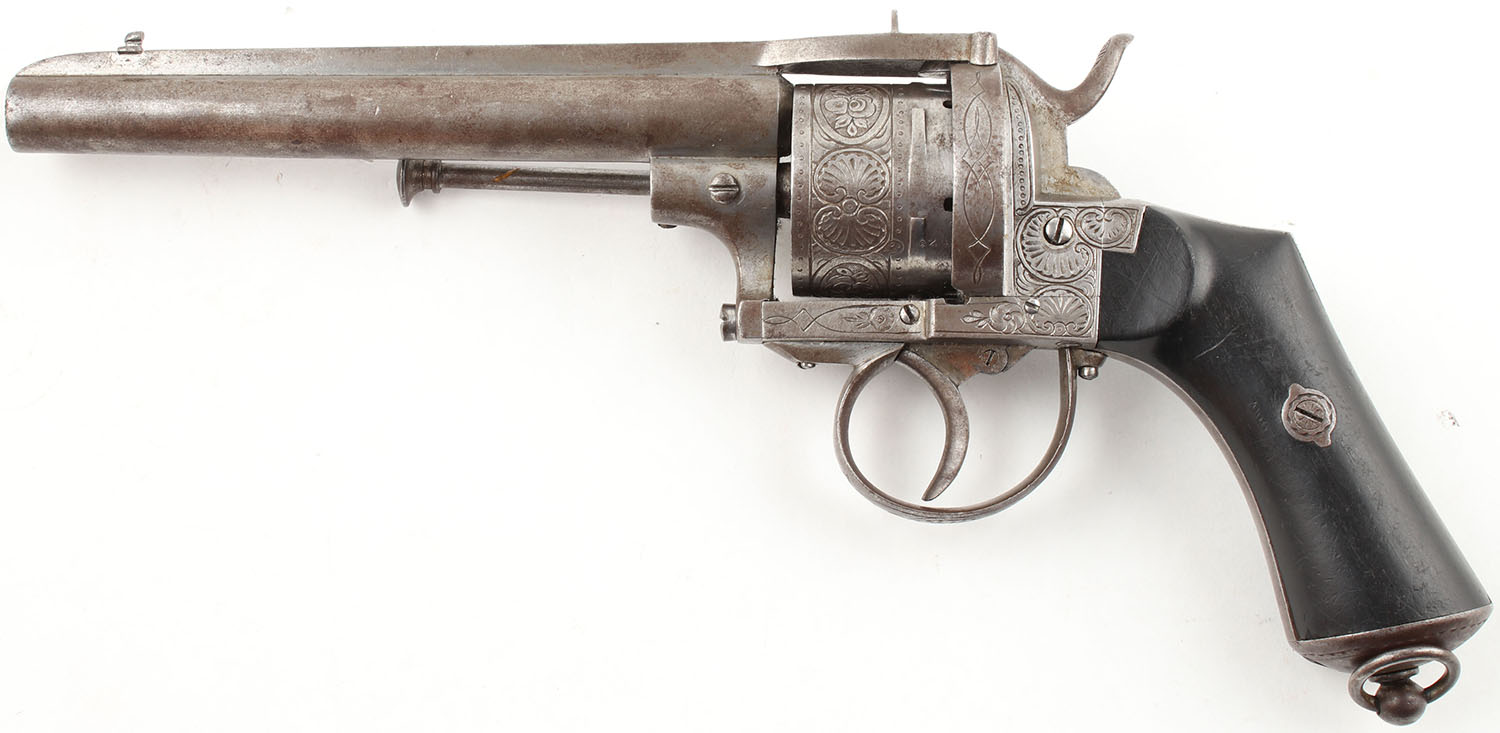 Belgian LeFaucheux Civil War Era Revolver, CAL: 12mm PinFire, MFG: 1858-73, SN: 700, Double Action Revolver, 6 1/8'' barrel. The cylinder is marked with Leige ''ELG in Crown'' proof & ''Crown/N''. The SN can be seen on the right side of the frame. The revolver is tastefully hand engraved with ornamental & punch dot work. The original Ebony grips are very good & solid. The bottom rear corner of the right grip has an edge chip. The original blued finish has mostly worn to metal gray & toned to a thin brown patina, with remnants in heavily protected areas. Bore is good & bright, with intermittent pitting & roughness. Fixed rear sight & small beaded blade front sight. Lanyard loop. A nice example of a Belgian LeFaucheux revolver. Antique, No FFL Req. - Value: 1000 to 3000