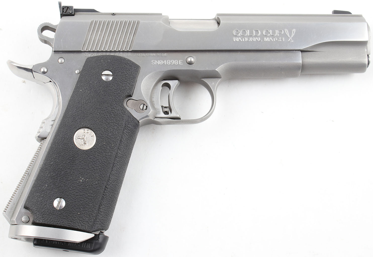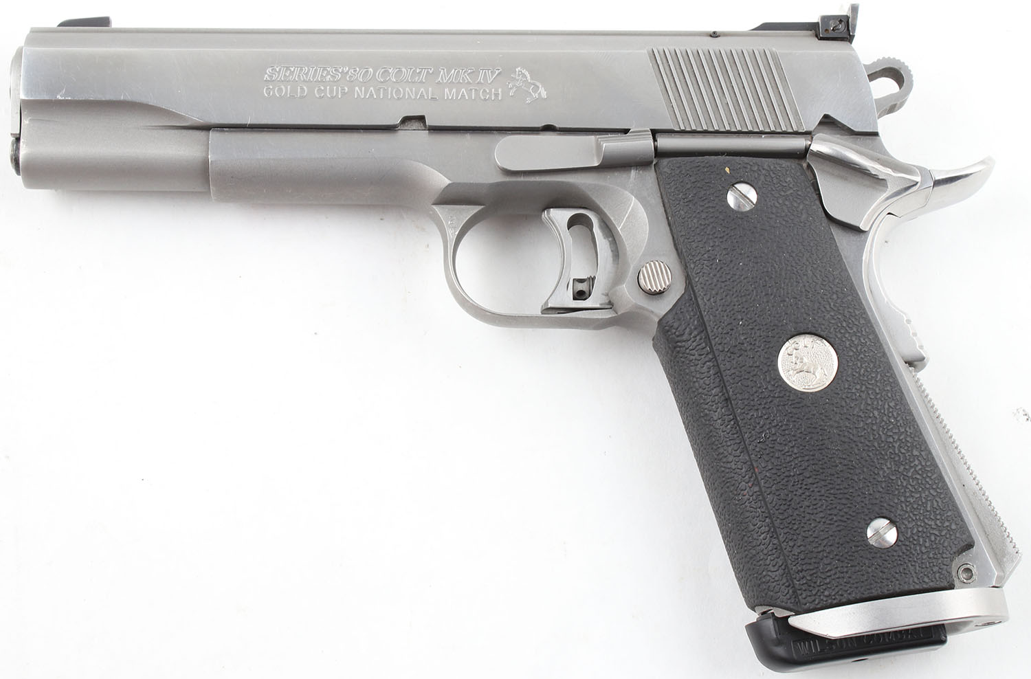 Colt, Series 80 MKIV Gold Cup National Match, CAL: 45 ACP, MFG: 1993, SN: SN04898E, Single Action Semi Auto Pistol, 5'' Barrel. The textured rubber grips with colt medallions are in excellent condition with minimal wear. The stainless finish is very good, near excellent, with very light wear and some small surface scratches. Bore is very good, bright with slightly thinned rifling. Mechanically solid, seems to function well. The parts fitment is very good, the slide/frame fitment is fairly tight with very little play. This 1911 seems to have slightly better parts fitment than one would expect from a colt of this era. The slide holds a fixed front sight and a windage and elevation adjustable rear sight. The sight picture is all black. Comes with a generic soft nylon holster and two Wilson combat magazines. FFL Req. - Value: 800 to 1600