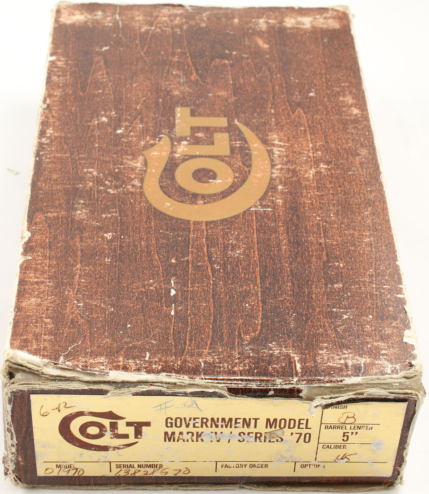 BOXED Colt, MK IV Series 70 Government Model 1911, CAL: 45 ACP, MFG: 1976, SN: 13838G70, Single Action Semi Auto Pistol, 5'' Barrel. The factory checkered wood grips with Colt medallions are in excellent condition. The original blued finish on the sides of the slide and frame rates approximately 99% with minimal wear. The matte finish on the gun is excellent with minimal wear. Bore is excellent, bright with strong rifling. Mechanically solid, seems to function well. The parts fitment is good with play in the frame and slide one would expect from a factory Colt 1911 of this era, this gun seems to be very lightly used and is an excellent example of a Colt from the 70's. The slide holds fixed all black front and rear sights. Comes in the serially matched factory box with the plastic gun sleeve, a magazine and some related paperwork. FFL Req. - Value: 1000 to 1600