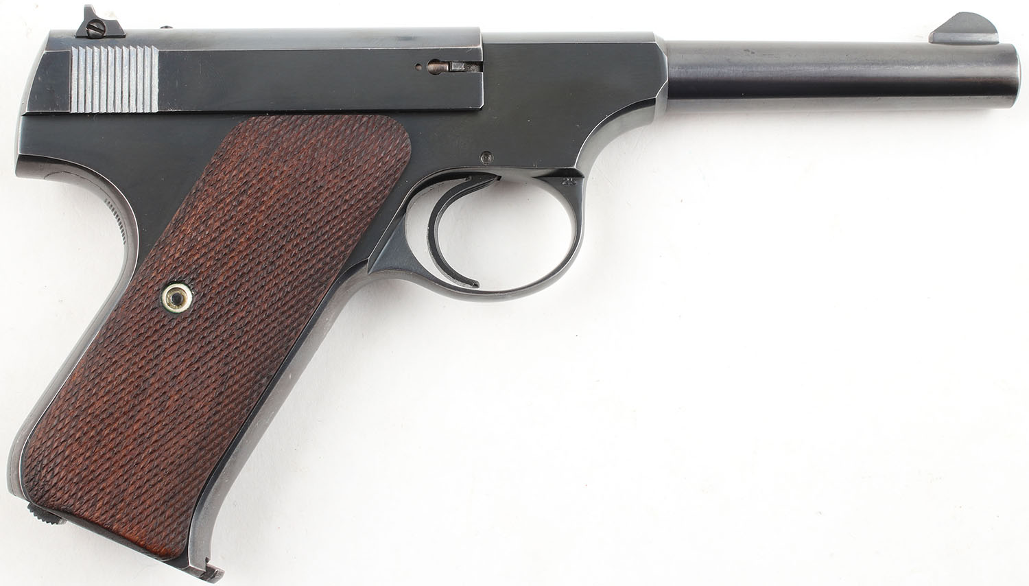 Colt, Woodsman 1st Series Sport Model, CAL: 22 LR, MFG: 1937, SN: 107100, Semi Auto Pistol, 4 1/2'' Barrel. The factory checkered wood grips are in excellent condition, sold with minimal wear. The blued finish on the gun rates approximately 95% with some handling and holster wear. Most of the wear is concentrated on the front strap and backstrap of the grip with some wear on the barrel near the muzzle as well as very light edge wear. Bore is excellent, bright with strong rifling. Mechanically solid, seems to function well. The barrel holds a fixed front sight, there is a rear sight set in a dovetail cut on the slide. The sight picture is all black. Comes with a magazine. FFL or C&R Req. - Value: 900 to 1700