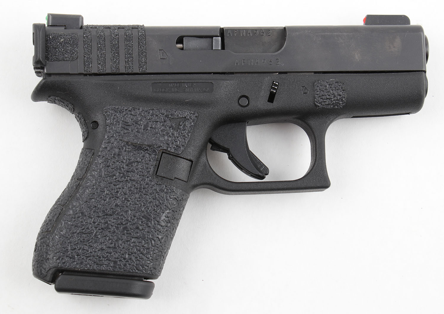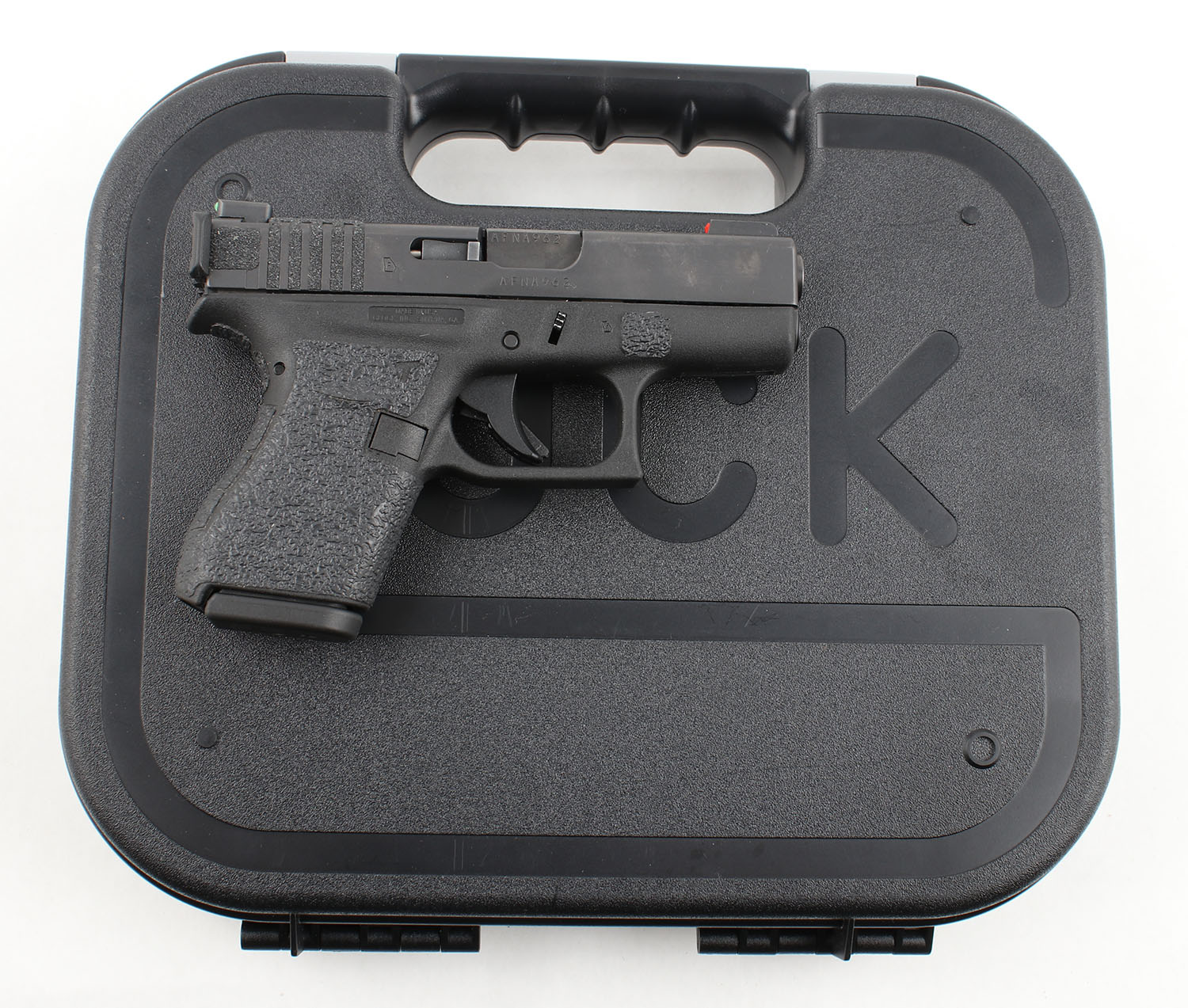 CASED Glock (USA), 42, CAL: 380 ACP, MFG: Modern, SN: AFNA962, Semi Auto Pistol, 3 1/4'' Barrel. The polymer grip frame is excellent with very light wear. The grip holds Talon grip tape with rubberized texture. The black finish on the slide & barrel is very good, near excellent, with light handling wear & light edge wear concentrated on the top edges of the slide. The rear slide serrations hold aggressive (sand paper like) Talon tape for better grip. The rear slide plate has been replaced with an extended plate that has serrated wings which hang over the left & right edges of the slide by approximately 0.15 inches. The combination of the grip tape & winged slide plate makes the slide incredibly easy to hang on to while charging the weapon. Bore is excellent, bright with strong rifling. Mechanically solid, seems to function well. The slide holds 3 dot fiberoptic contrast sights, the front sight being red & the rear being green. Comes in the serially matched factory hard plastic case with one 6 round magazine, a speed loader, a bore brush, an owners manual, & other related paperwork. FFL Req. - Value: 300 to 450