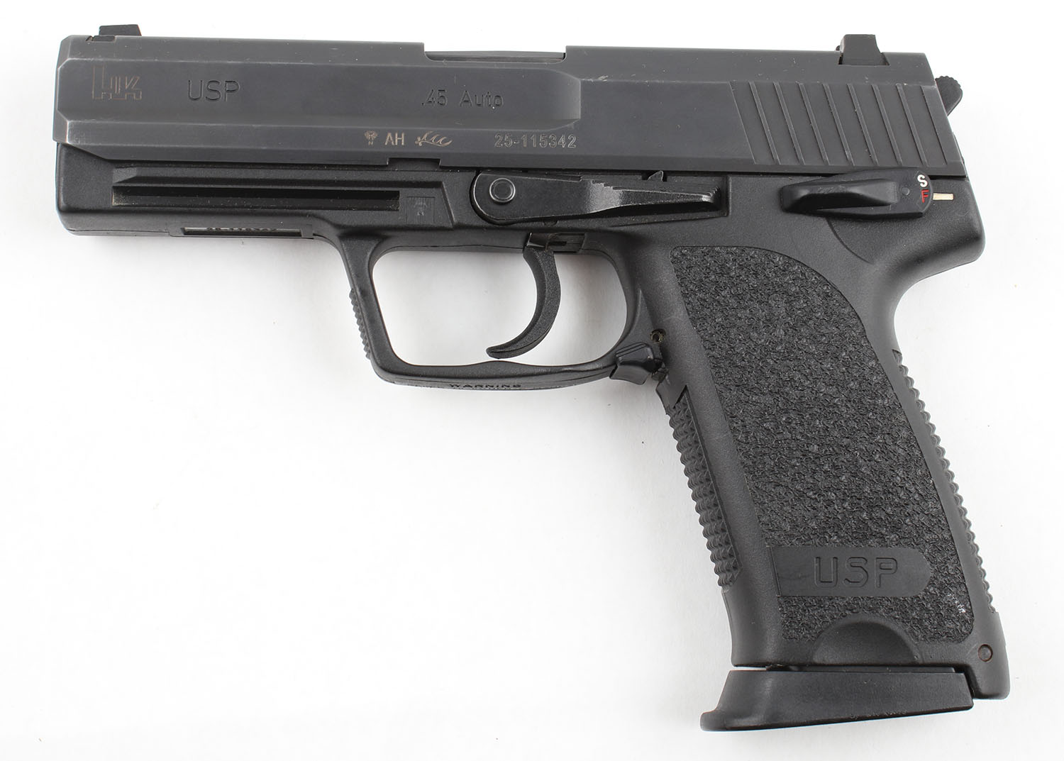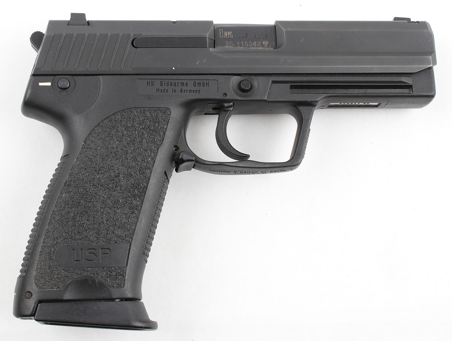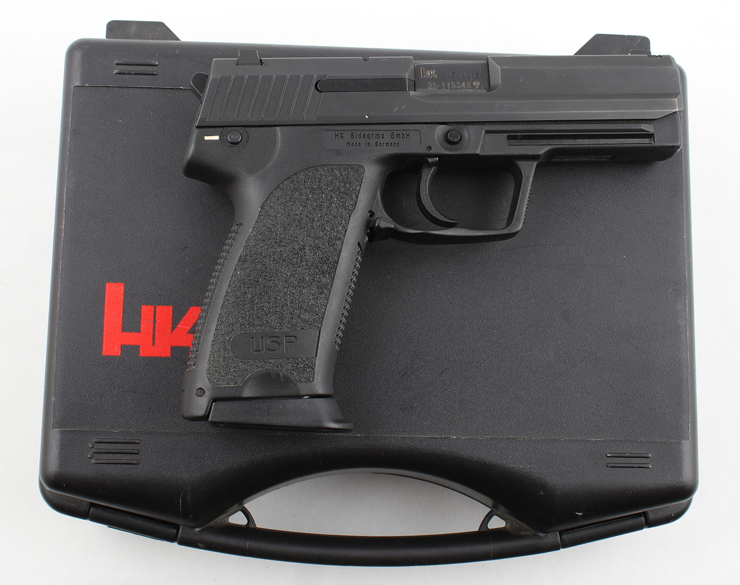 CASED Heckler & Koch (H&K, Germany), USP, CAL: 45 ACP, MFG: 2007, SN: 25-115342, Double Action/Single Action Semi Auto Pistol, 4 1/4'' Barrel. The polymer grip frame is excellent with very light wear. The black finish on the slide & barrel is excellent with very light handling wear. Bore is excellent, bright with polygonal rifling. Mechanically solid, seems to function well. The slide holds fixed 3 dot white combat sights in dovetail cuts. Comes in the serially matched factory hard plastic case with three 12 round magazines, one of which is marked ''Restricted Law Enforcement / Government Use Only 10 - 94''. FFL Req. - Value: 700 to 1400