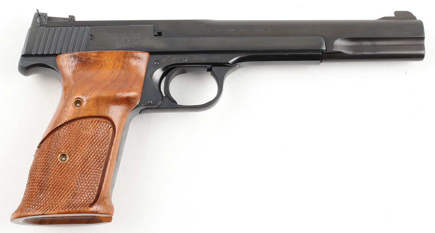 Smith & Wesson, Model 41, CAL: 22 LR, MFG: 1980's-90's, SN: TAF2399, Semi Auto Pistol, 7'' Barrel. The factory checkered wood grips are very good, near excellent, solid with minimal wear. There is a small chip on the right grip panel near the bottom of the trigger guard. The blued finish on the gun rates approximately 95% with nearly full coverage. The blue on the slide has begun to thin & tone to a plumb patina. Bore is excellent, bright with strong rifling. Mechanically solid, seems to function well. A fixed black front sight is integral to the barrel, a windage & elevation adjustable rear sight is mounted to the slide. Comes with a magazine. FFL Req. - Value: 900 to 1600