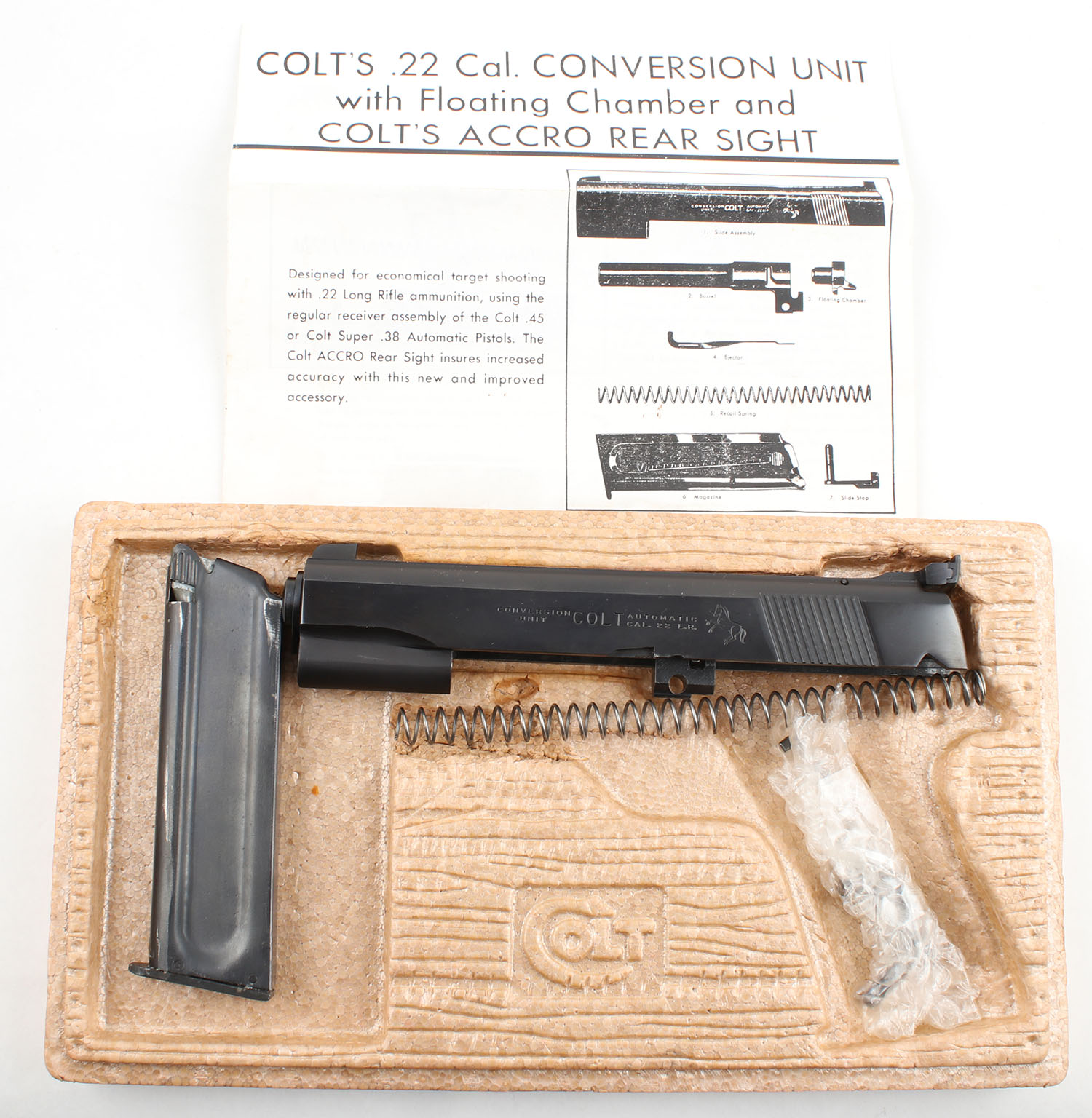 BOXED (Conversion Kit) Colt, 45 ACP & 38 Super Government Model (1911), converts firearm to 22 LR. Comes in a correct factory box with an instructions manual & all of the parts listed on the manual. The blued finish on the slide rates approximately 99% with minimal wear. Bore is excellent, bright with strong rifling. The slide holds a fixed front sight & windage & elevation adjustable rear sight. The sight picture is all black. Parts, No FFL Req. - Value: 250 to 500
