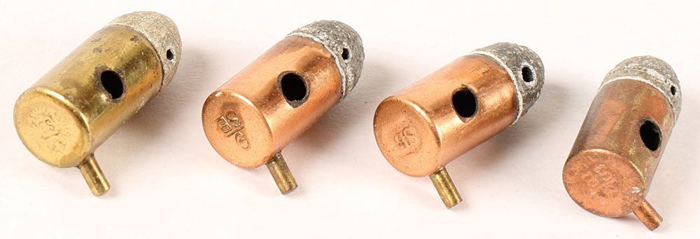 Lot of 4, 9mm Pinfire Cartridges, by Sellier Bellot. (2) HS:''9 SB'', PT lead, copper case. (1) HS:''SB'' raised in rectangle, PT lead. (1) HS:''SB'' with crossed flag. All have one non-factory hole in case. Grade Very Good - Value: 4 to 20