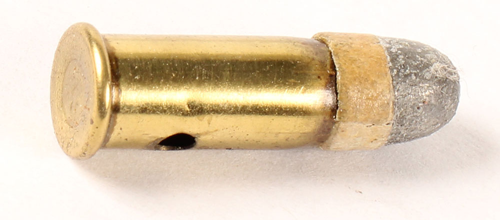 7.5mm Swiss Revolver Rimfire (.699'' case). HS:''St'', PT Lead. Brass Case. Has one hole in case. Grade Very Good - Value: 10 to 35