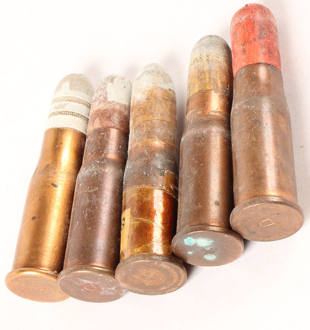 Lot of 5, 10.4 Swiss Vetterli Rimfire. (2) HS: Swiss Military cross. RN PP Lead. (1) HS:''H'' impressed, RN Lead. (1) HS:''C'' raised, RN PP Lead. (1) SHOT LOAD, HS:''U'' impressed, Red fiber Sabot. Grade Very Good. - Value: 20 to 30